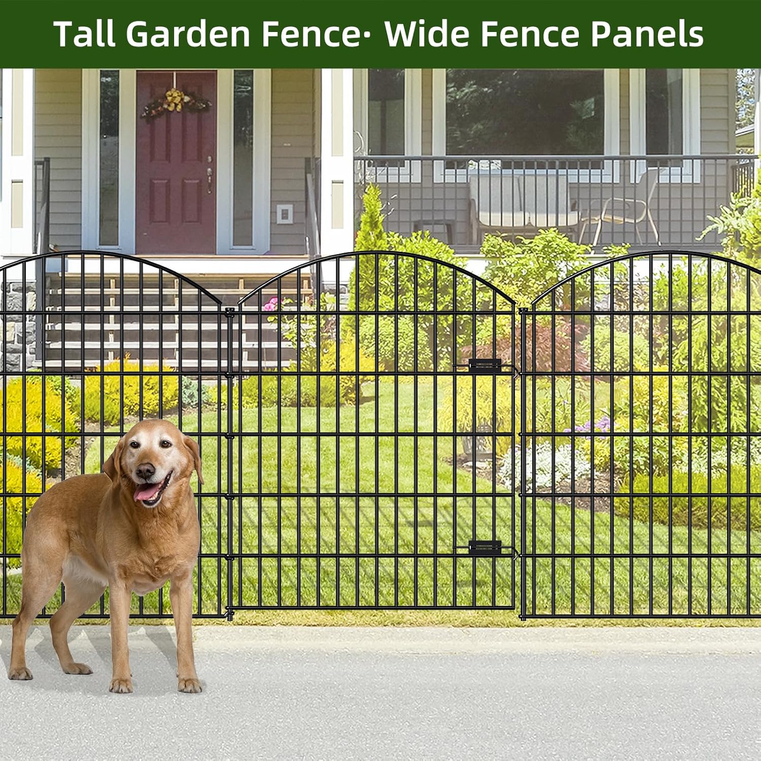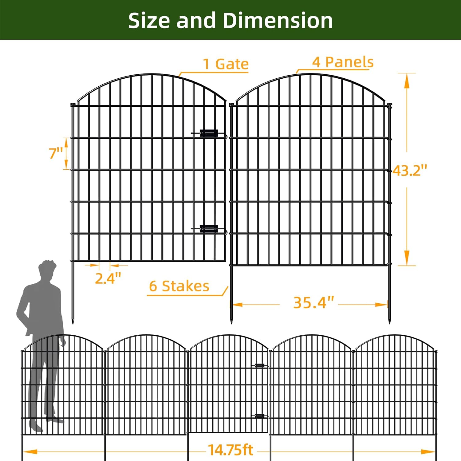 - WHAT'S INCLUDED: 1 Gate+4 Fence Panels+6 Stakes in a bundle. Gate sized 34.7"Wx42.2"H, each Fence Panel sized 35.4"Wx43.2"H, each Stake 49.2 inches Height, linear length 14.75 feet, Black color.