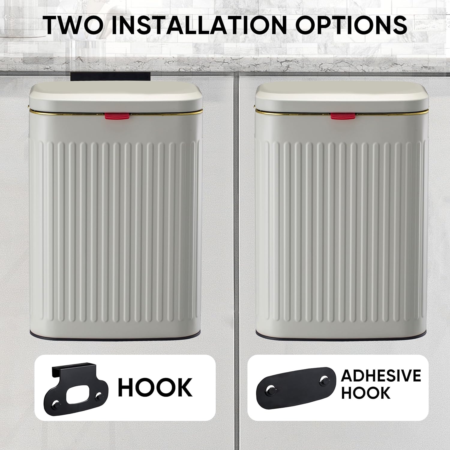 - [Hanging on The Door or On the Wall]Using the hanging hook equipped, hang the hook on the cupboard door then hang this lovely compost bin on it. If you want to fix it on the smooth wall, you could also use our adhesive hook equipped. Place the adhesive hook on the smooth wall, like ceramics,glasses for 48 hours, then hang this trash bin on it.