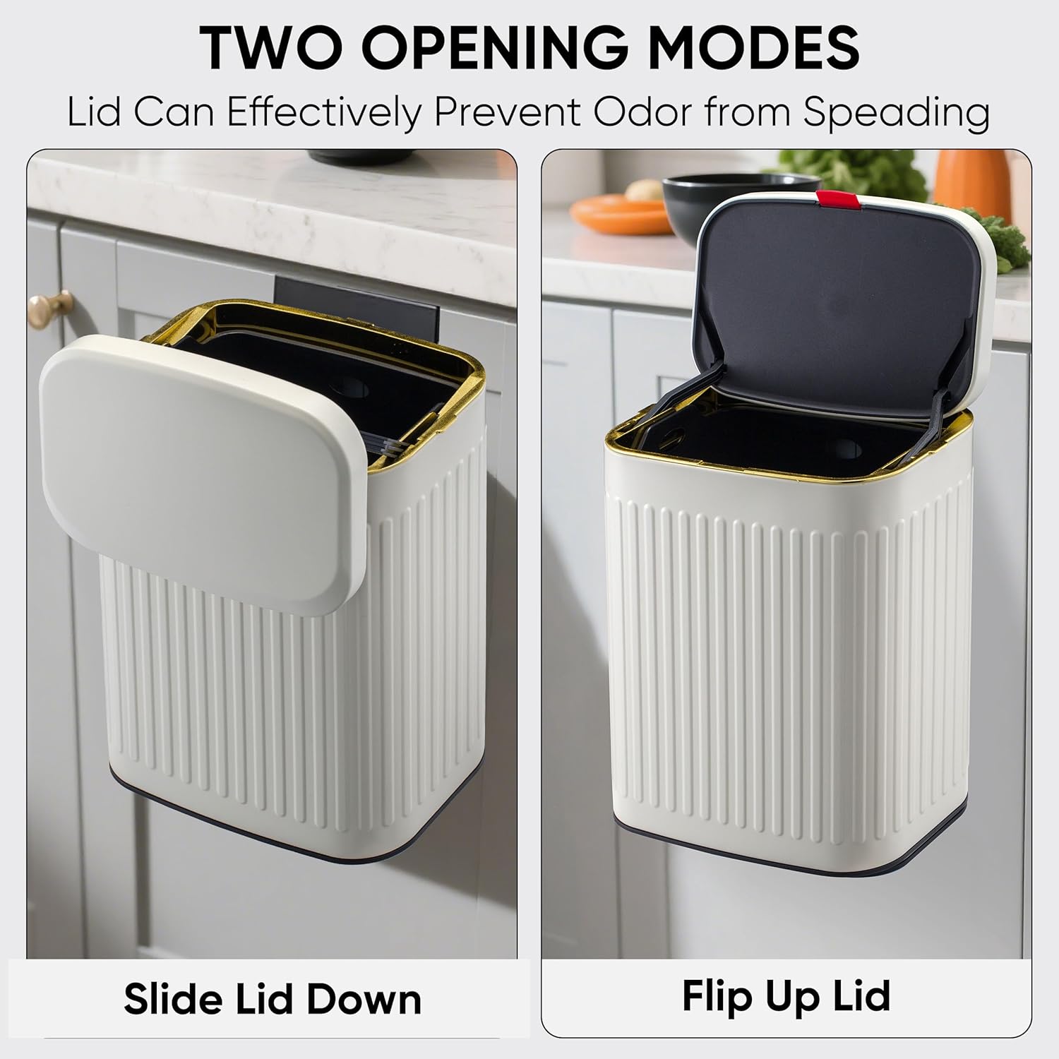 - [Kitchen Trash Bin with 2 Ways Slide Lid] The kitchen countertop trash can is equipped with a 2 ways sliding lid, you could lift the lid directly or slide the lid at the opposite direction thanks to its creative design.