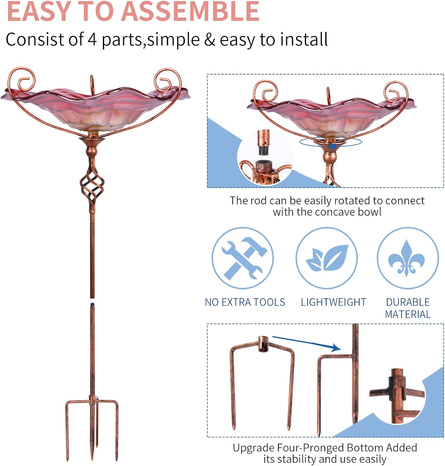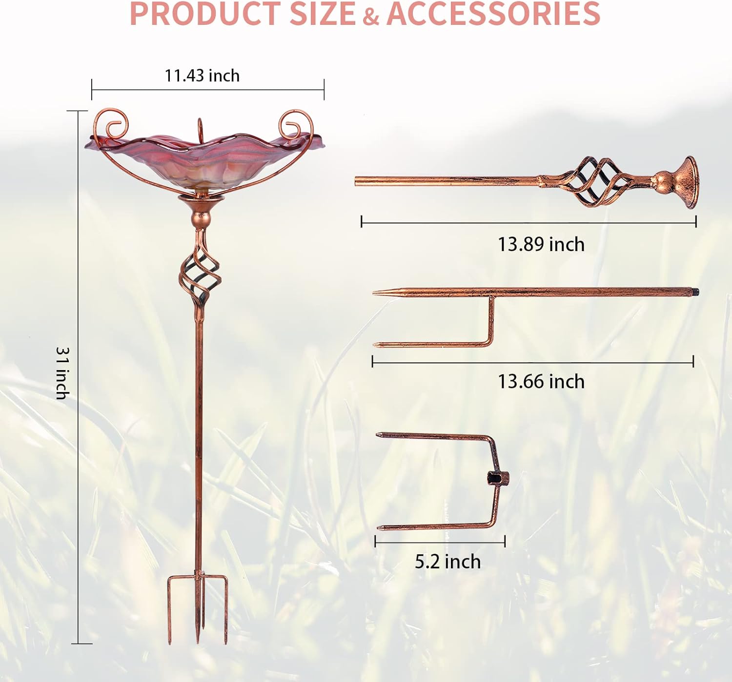 VCUTEKA Bird Bath, Glass Bird Baths for Outdoors Birdfeeder with Metal Stake Birdbath Garden Decor, Red