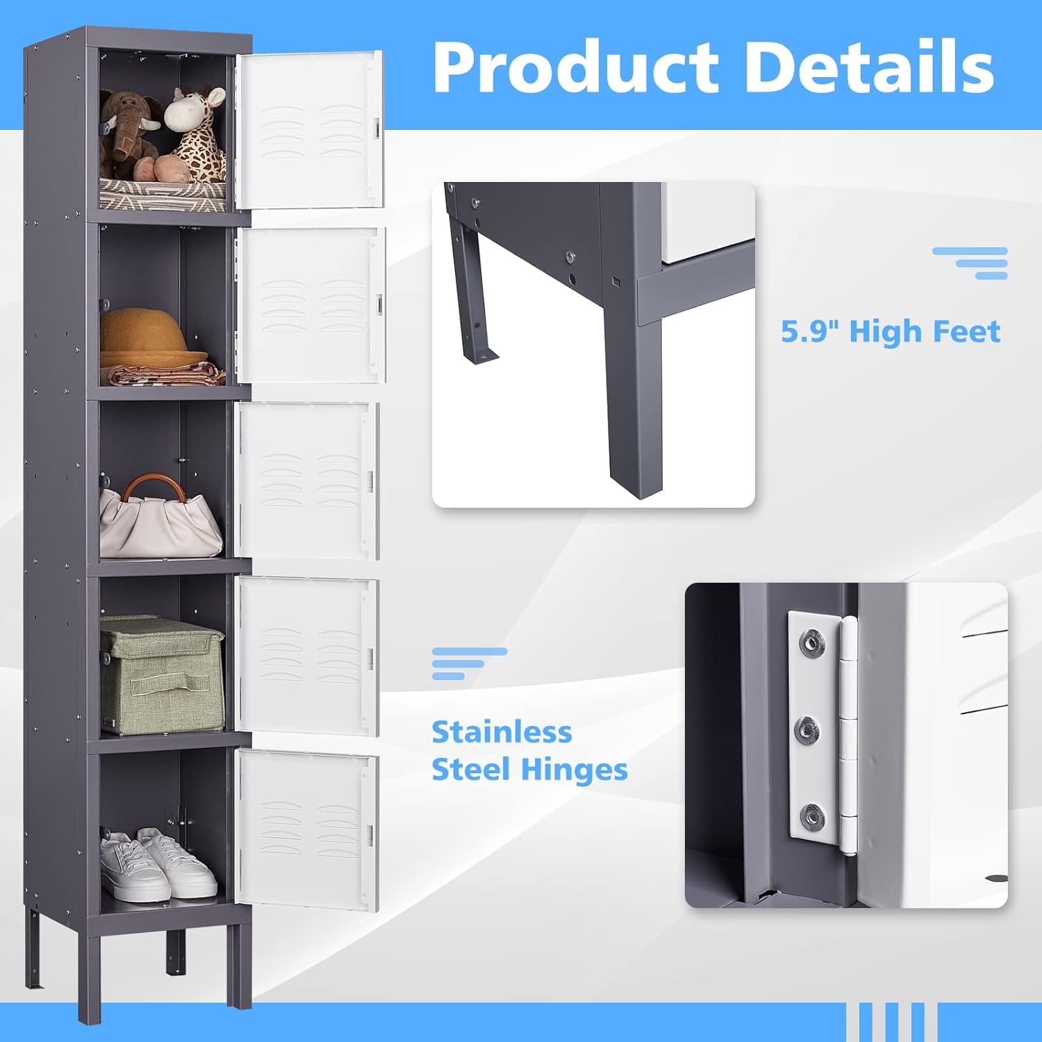 - 『Large Storage Space』: Locker Dimensions 12W x 12D x 66H inch. 5 Door steel lockers classifiedis storage ,large size to make sure you have large space to lock up your tools, clothes, shoes , sports gear, bags cet.