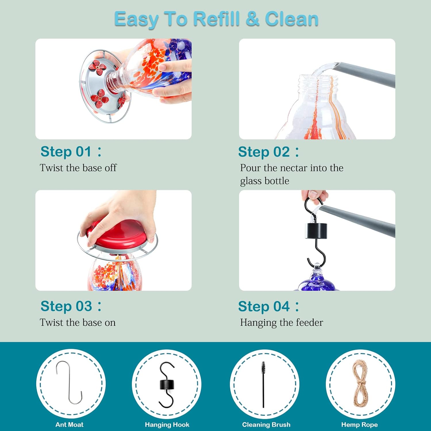 - Hand Blown Glass Hummingbird Feeder: The hummingbird feeders have charming and beautiful surfaces sparkling in the sun to attract hummingbirds to your garden. The actual product will differ slightly from the picture shown, as each product is hand-blown by artisans