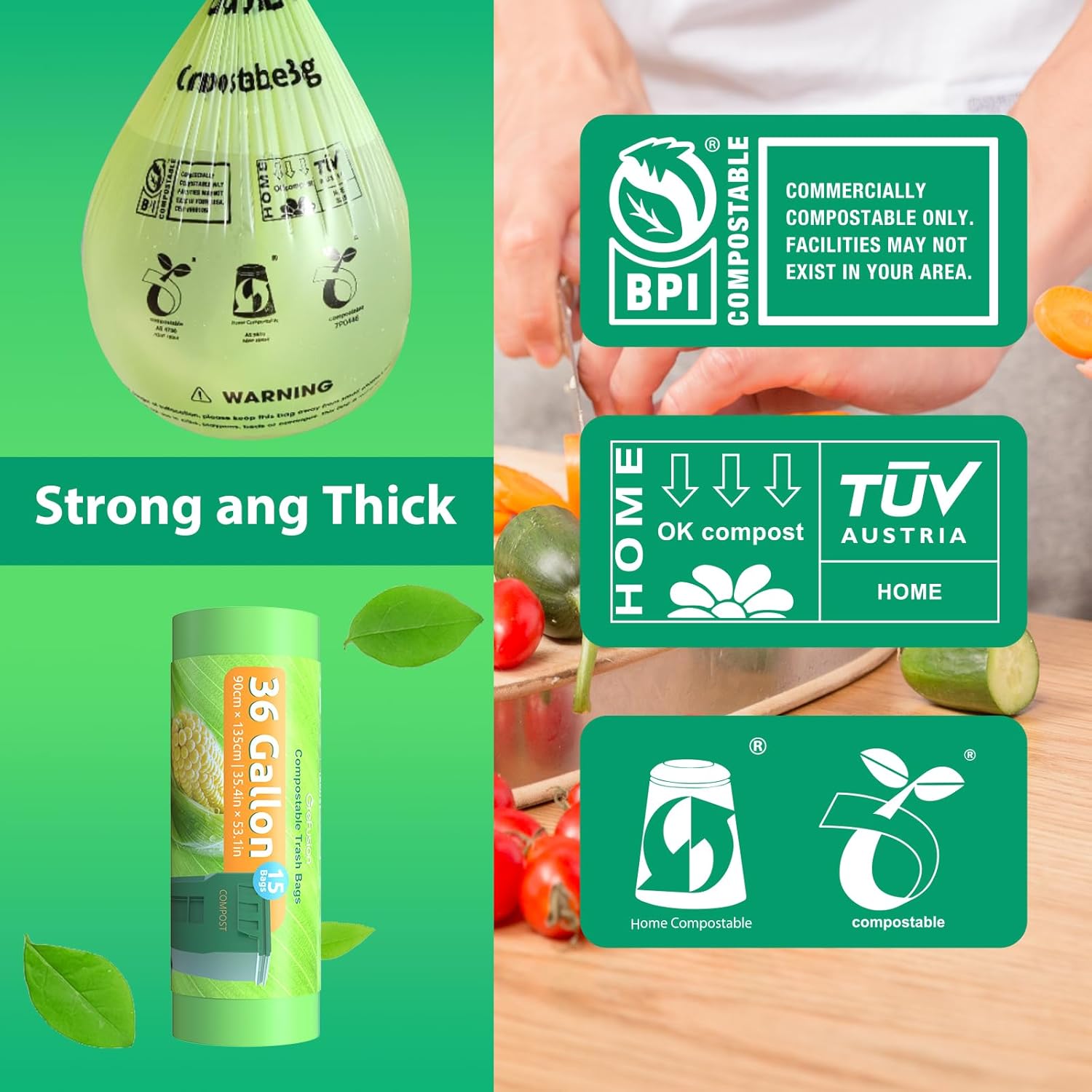 - 🌎【ASTM D6400&BPI CERTIFIED COMPOSTABLE BAGS】The compostable garbage bags are designed for both industrial use and for home use,certified by BPI ,Compostable (ASTM-D6400&EU EN13432 standard),OK Compost HOME (EU Standard).All professionally managed composting facilities are able to accept our compostable bags. You can use these large trash bags to collect kitchen scraps and put them straight into the recycle trash can.