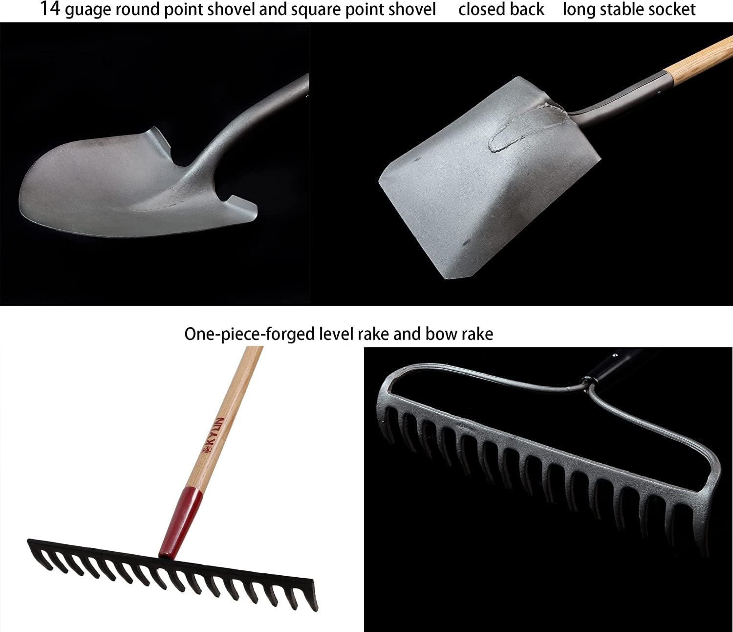 - High Quality And Grate Value For Professional 8Pcs Gardening Tool Set contains one 14-gauge round point shovel, one 14-gauge square point shovel, one forged 15T bow rake, one forged 16T level head rake,one forged garden hoe, one forged sidewalk scraper,one forged sod lifter, one 12”blade bush hook. The handle are all premium north wood ash handle. One tools set for all the diverse needs.