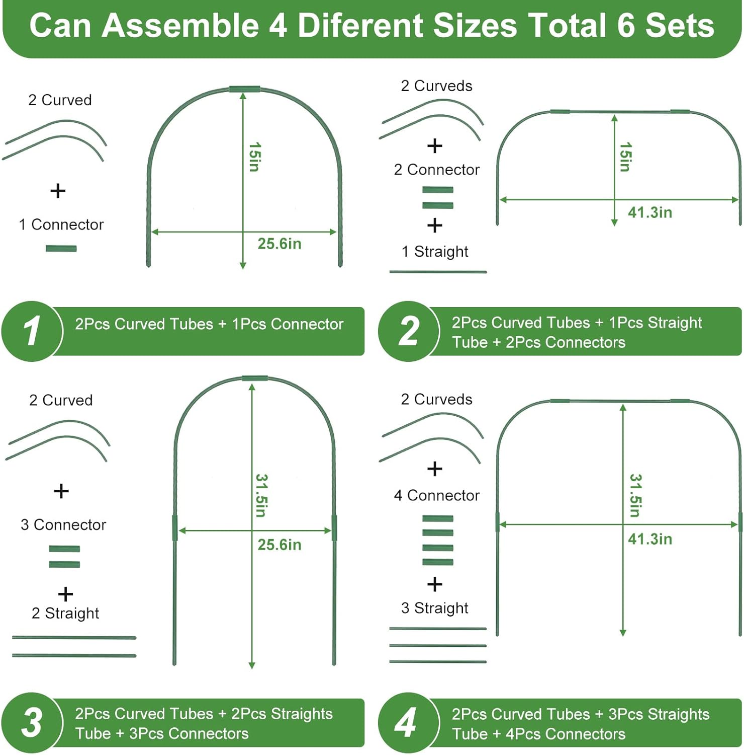 - đ±ăGreenhouse Hoops DIY Kit Includeă: Garden Bed Hoops contains 16 curved tubes, 24pcs Stright Hoops,32 pcs connecting pipes and 24pcs clips (a total of 8 sets of greenhouse hoops 41.3" in Wide, 31.5" Height) You can combine with hoops to DIY your own grow tunnel, it can be DIY 4 Different Types.And you can use the clips to fix the greenhouse covering.