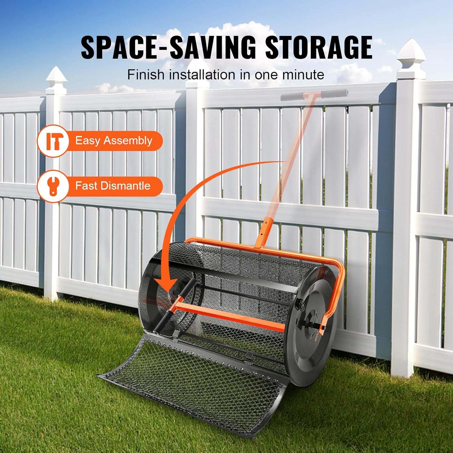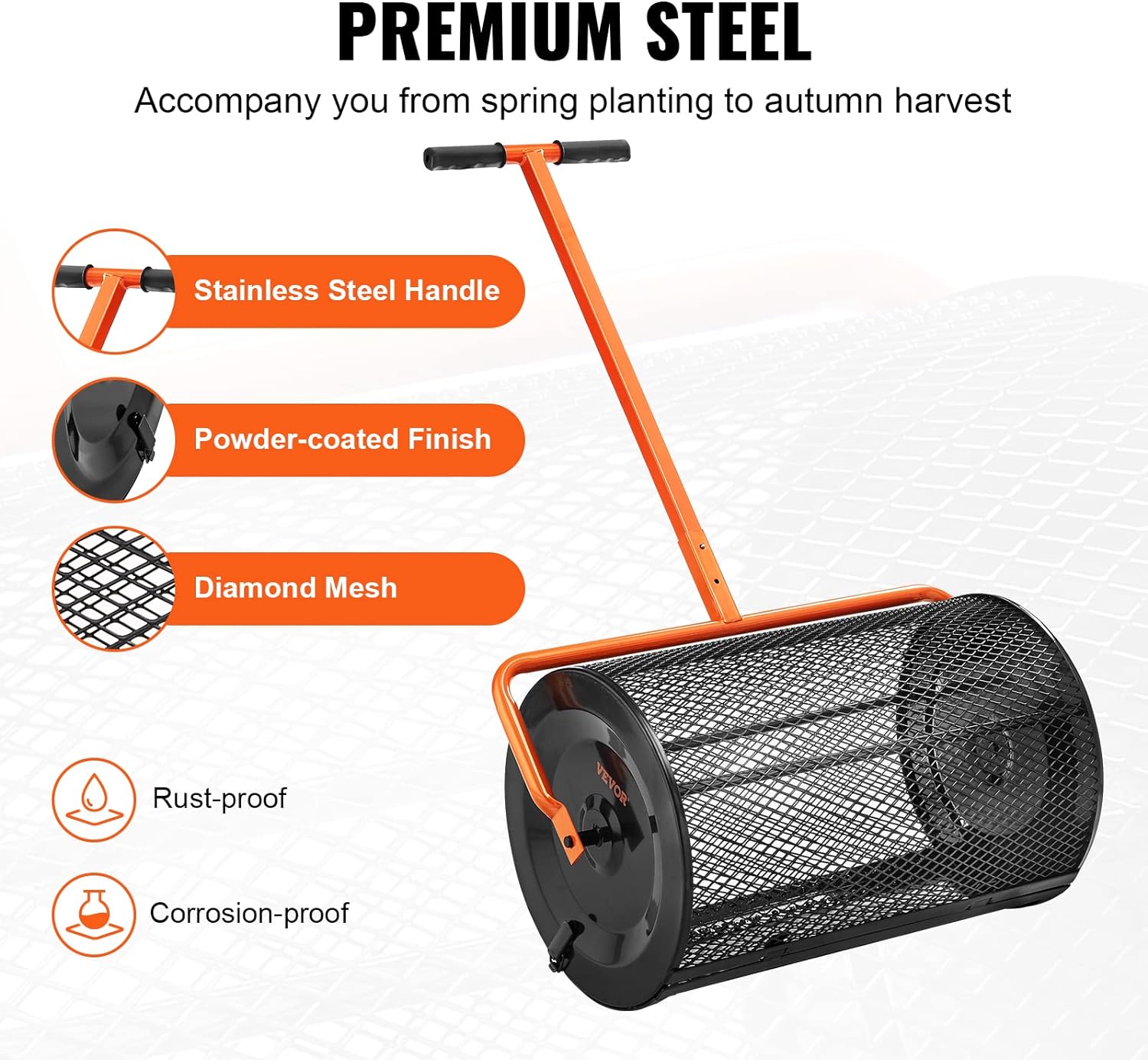 VEVOR Compost Spreader, 24.4-25.6" Height Adjustable Handle, 24" Wide, Lawn and Garden Peat Moss Roller with Side Latches, Powder Coated Steel Mesh Basket for Spreading Manure, Topsoil, Black