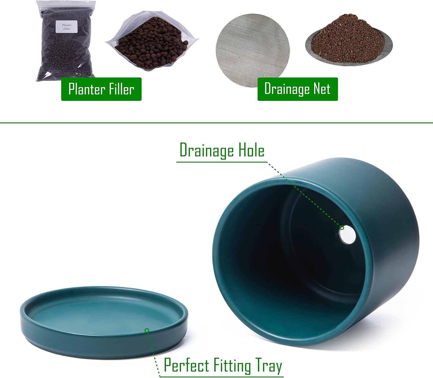 D'vine Dev 6 Inch Ceramic Planter Pot with Drainage Hole and Saucer, Indoor Cylinder Round Planter Pot, Teal, 94-O-C-9
