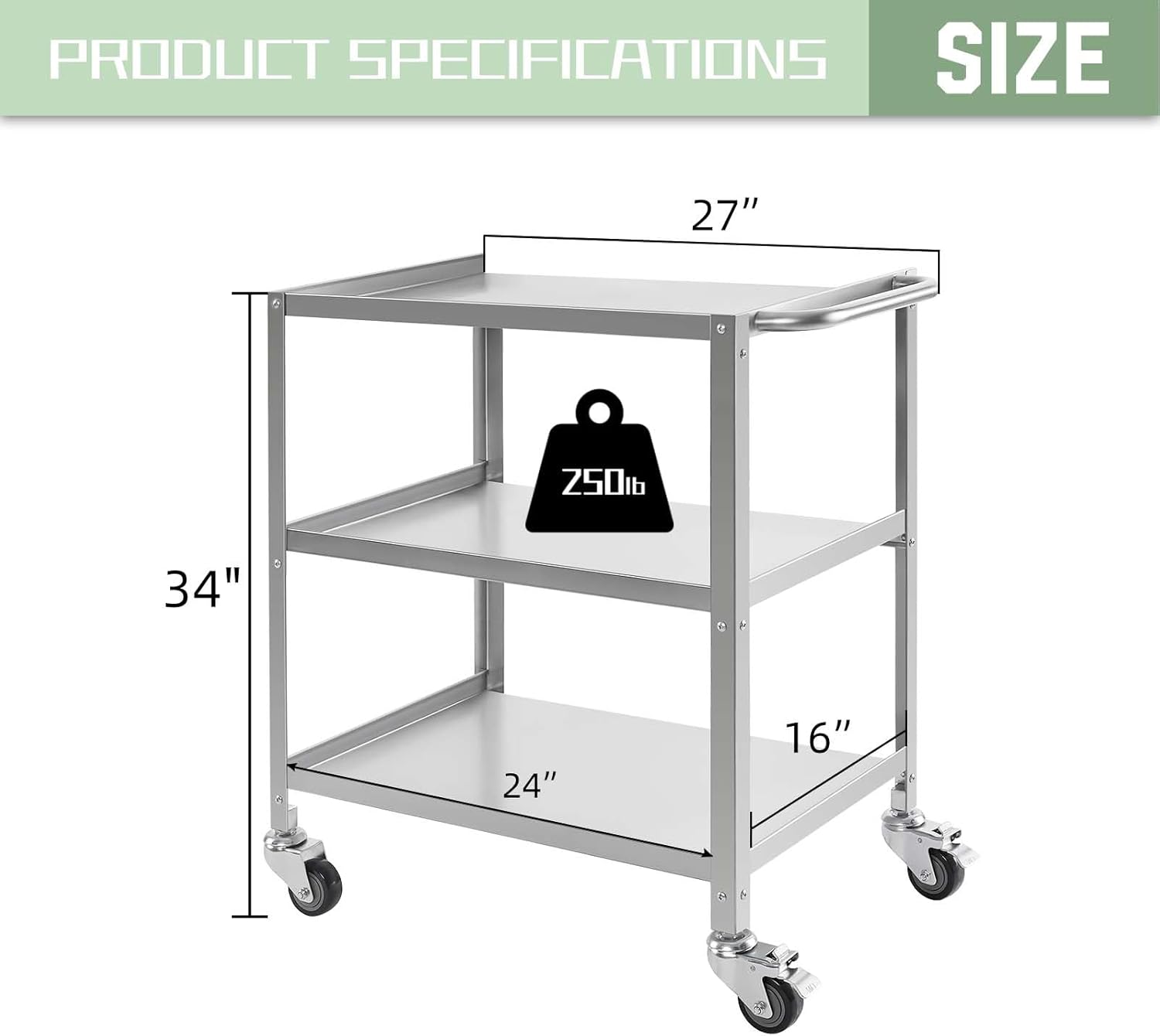 - Large Practical Storage: The 3 tier stainless steel utility cart is so convenient for storing items, with a load-bearing capacity of up to 250 lbs, suitable for kitchens, restaurants, laboratories, hospitals, offices, or any other commercial environment, and can be considered the perfect storage rack