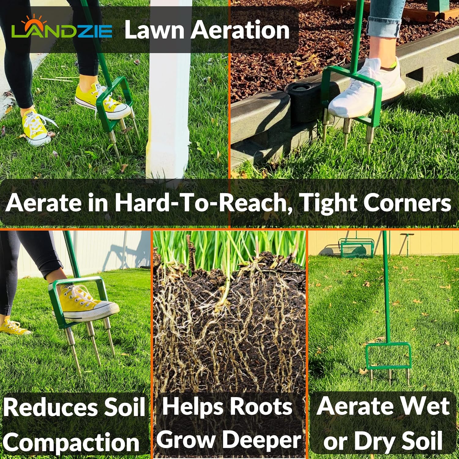 - HAVE THE LAWN OF YOUR DREAMS: Revitalize your lawn this season by using the Landzie Fork Lawn Plug Aerator to remove compacted soil and thatch and promote healthy grass growth throughout. Aerator coring your lawn encourages healthy root growth, enhances resistance to drought and flooding, and reduces the need for excessive amounts of fertilizer. USE your Landzie Soil Aerator with the Landzie Spreader (B07ZQSV81S) and the Landzie Lawn Level (B095KSKXPQ) for a lush and level lawn this season.