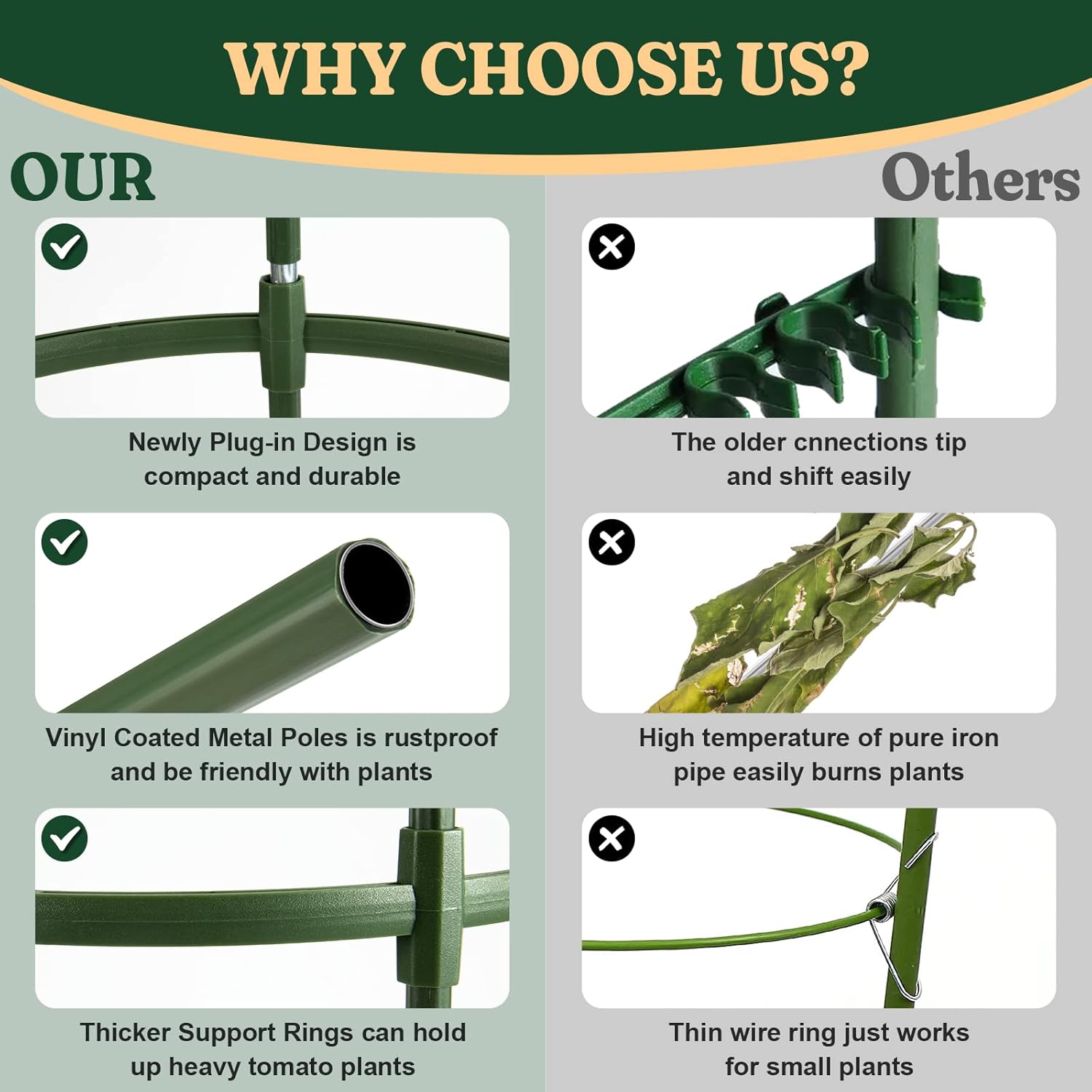 - 【New generation Plant Support Cage】Different from other tomato trellis, LOMNYIY tomato support cage have the newest plug-in connection, and unique double-layer metal tube built-in interface design to stay together tighter and more stable. And the poles are very hard with a metal core, yet are coated entirely in plastic to keep them from rusting, and the heat dissipation is good. It means strong durable performance can hold up in the wind with heavy tomato plants in them.