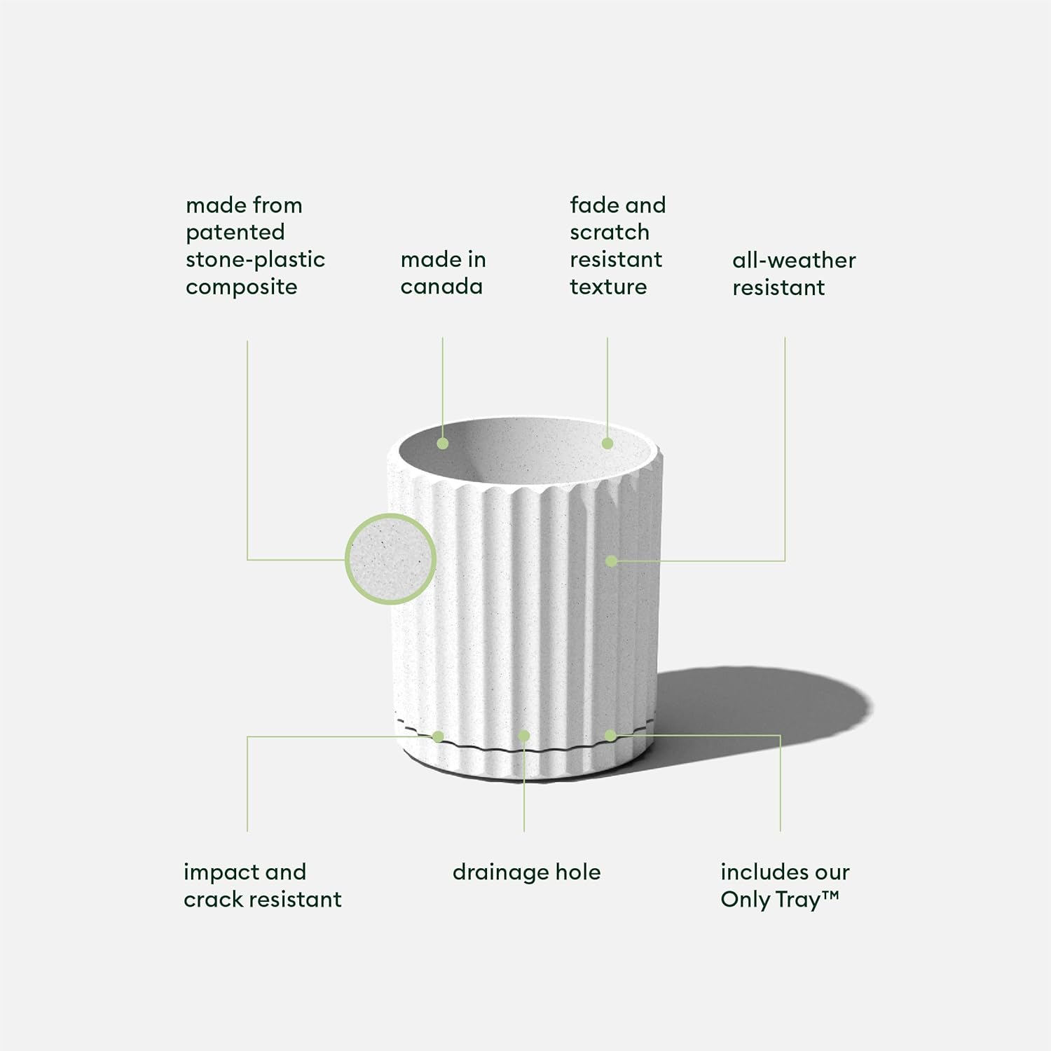 - Planter body made from a patented stone-plastic composite which provides the look of stone and durability of plastic