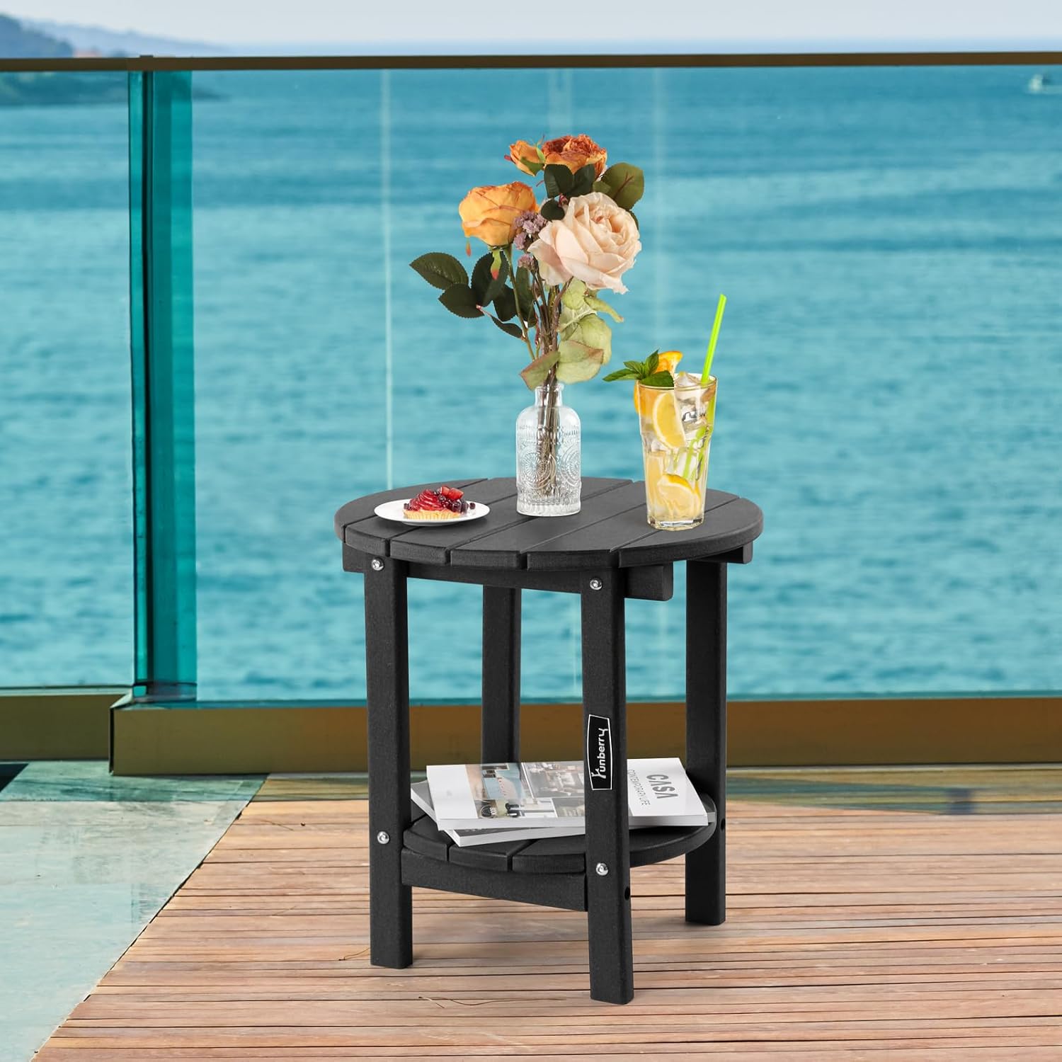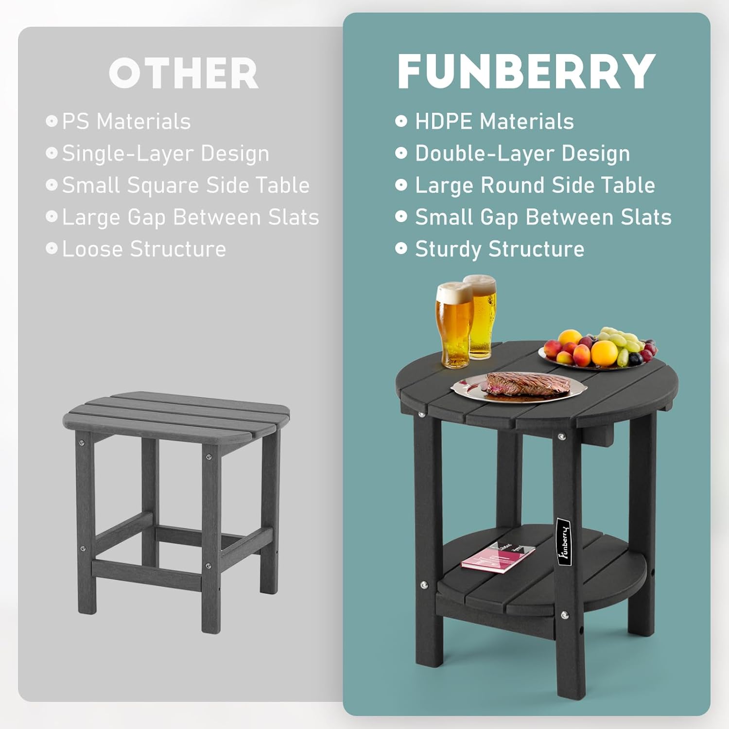 - Double Layers & Smooth Design: The 2-tier design of this outdoor side table provides more storage space for food, drinks, books and other items. The smooth edge design makes this patio table more safe especially for families with children. This patio side table is an ideal companion for Adirondack chairs, Rocking chairs and Chaise Lounge chairs.