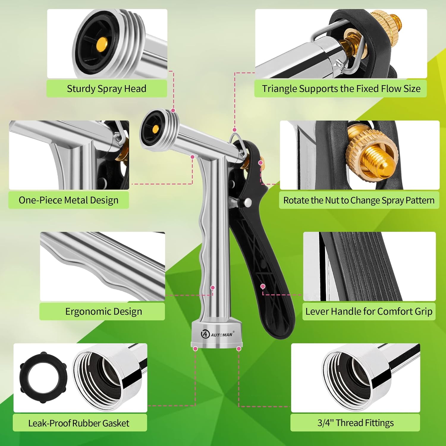 - ADJUSTABLE HIGH PRESSURE NOZZLE: AUTOMAN hose nozzles will meet your watering needs. If you’d like to adjust the water flow, you only need to press the handle to get flexible or adjustable water flow from fine mist, moderate cone spray and high pressure jet stream. Easy to use and a powerful nozzle you will get and love.