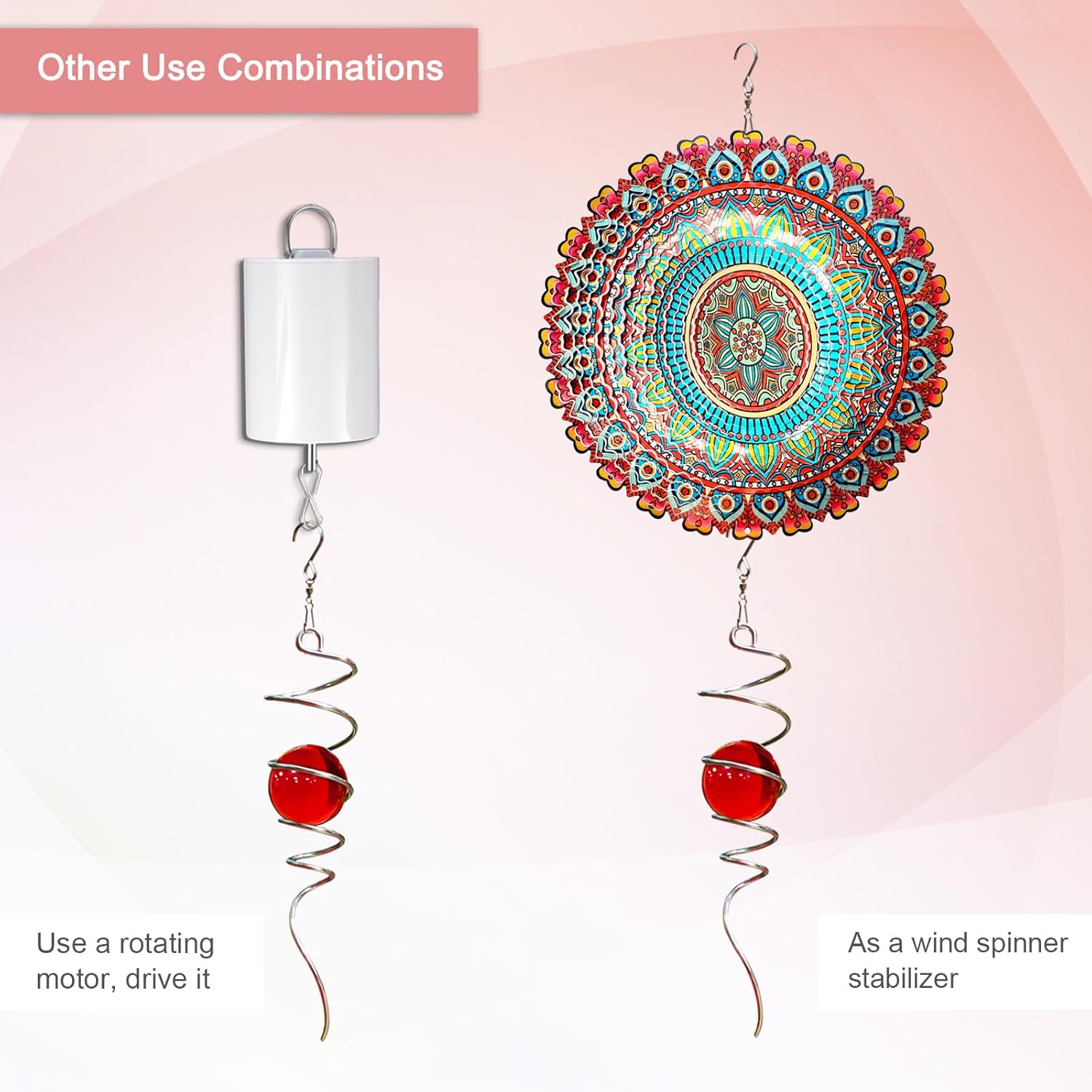 - ăWind Spinner Spiral TailăThe spiral tail works perfectly with the garden wind spinner, not only as a stabiliser to keep your yard wind spinner spinning smoothly in the wind, but also to enhance the overall aesthetics, taking your outdoor decoration to the next level.