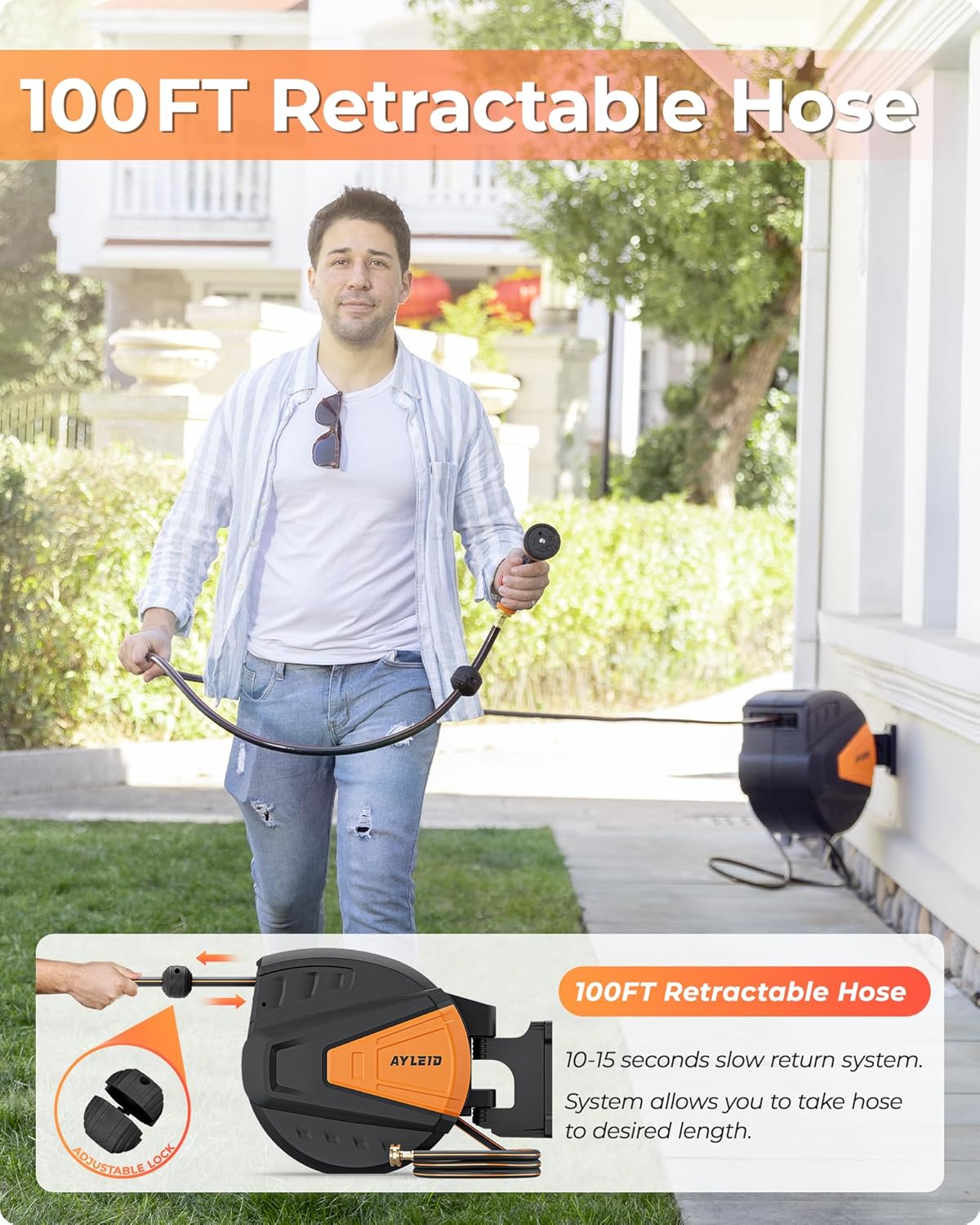 Ayleid Retractable Garden Hose Reel,5/8 in x 100 FT Wall Mounted Hose Reel, with 9- Function Sprayer Nozzle, Any Length Lock/Slow Return System/Wall Mounted/180°Swivel Bracket (Black)