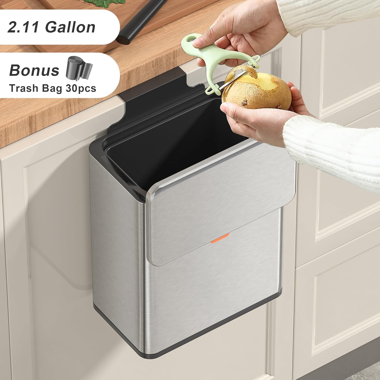 Mbillion Kitchen Compost Bin Hanging Trash Can with Lid 2.1 Gallon Stainless Steel Garbage Can for Kitchen Cabinet Door Mounted Trash Can Under Sink Door RV Bathroom,Silver