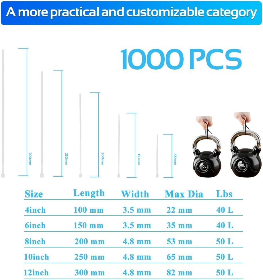 - High Tensile Strength: The 1000Pcs 10Inch White Cable Tie Zip Ties are industrial level heavy-duty ties with a tensile strength of 50 pounds, making them strong enough to secure and organize a variety of items.
