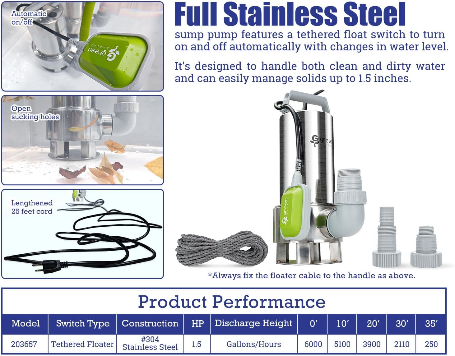 Green Expert 1.5HP Submersible Sump Pump 6000GPH High Flow Full 304 Stainless Steel with tethered Float Switch for Automatically Water Draining in Flooded Basement Pit Sewage Sink Pool Hot Tub