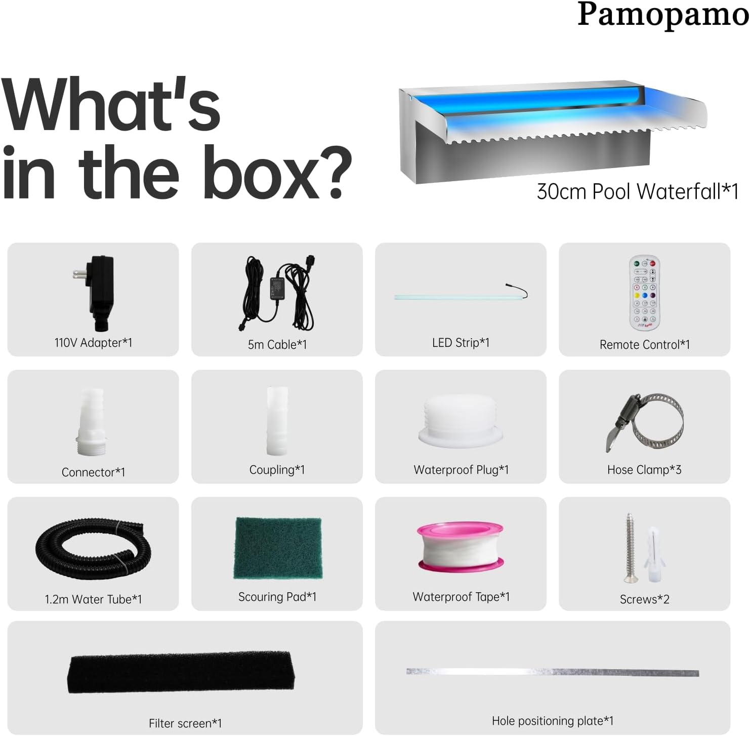 - ⏩App Control Waterproof Lights⏪ Pamopamo pool fountain is equipped with a waterproof LED light strip which can change multi colors via the RF remote or APP control. You can experience different modes through the mobile app, such as music mode, light mode, voice mode, etc.(When you can open the light strip cover, you will find that all the light beads inside have been waterproof. They can directly soak in water)