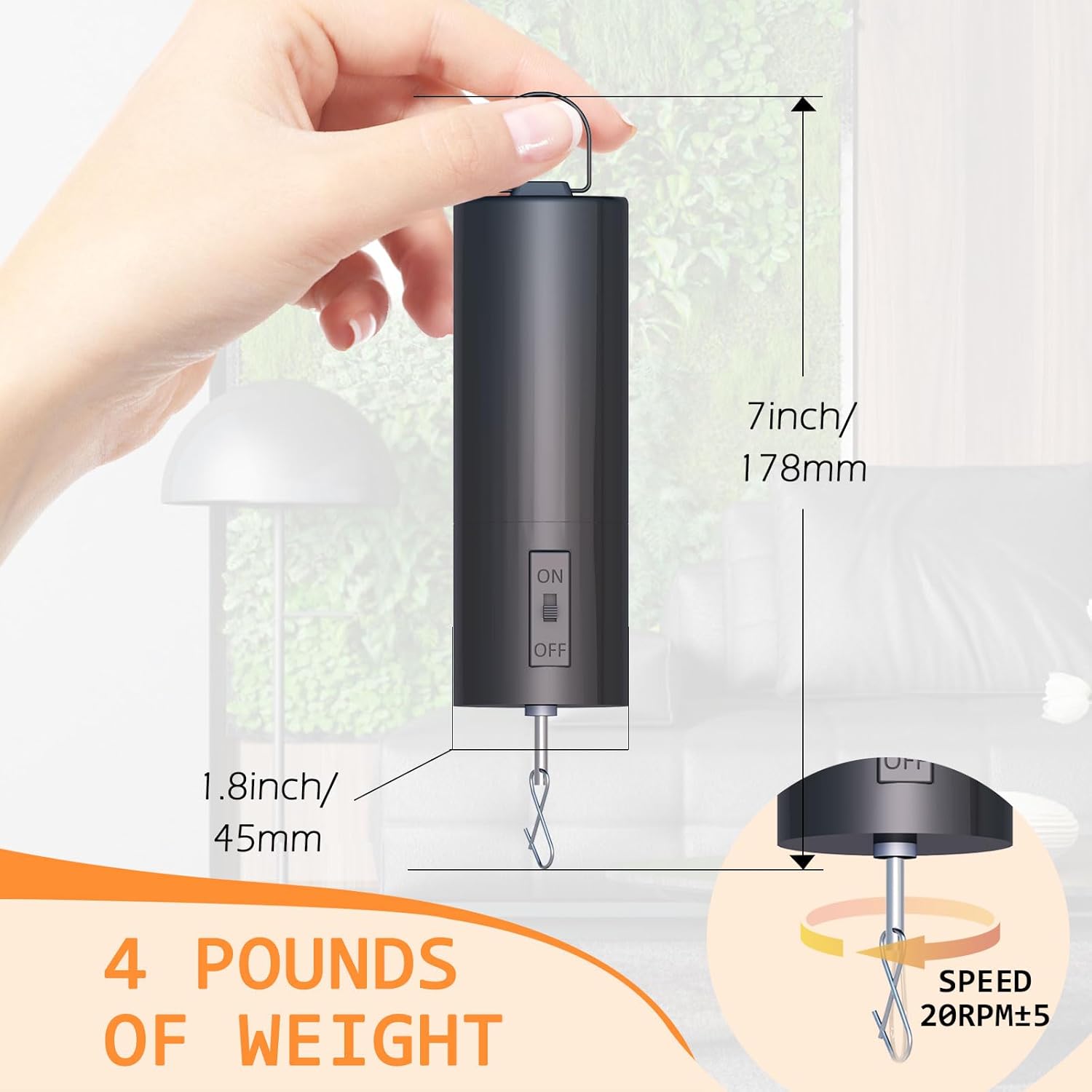 - 【Compact size】5.11in long ,1.69in diameter;Light weight:0.14 kg,Compact size with exquisite structure,easily to hang up to save place.Medium Revolving speed,approximately 30+/-5 RPM depending on battery power and item weight,the rotating speed of this small ornament motor can perfectly spin your hanging decor to show the cool reflective visual effect.
