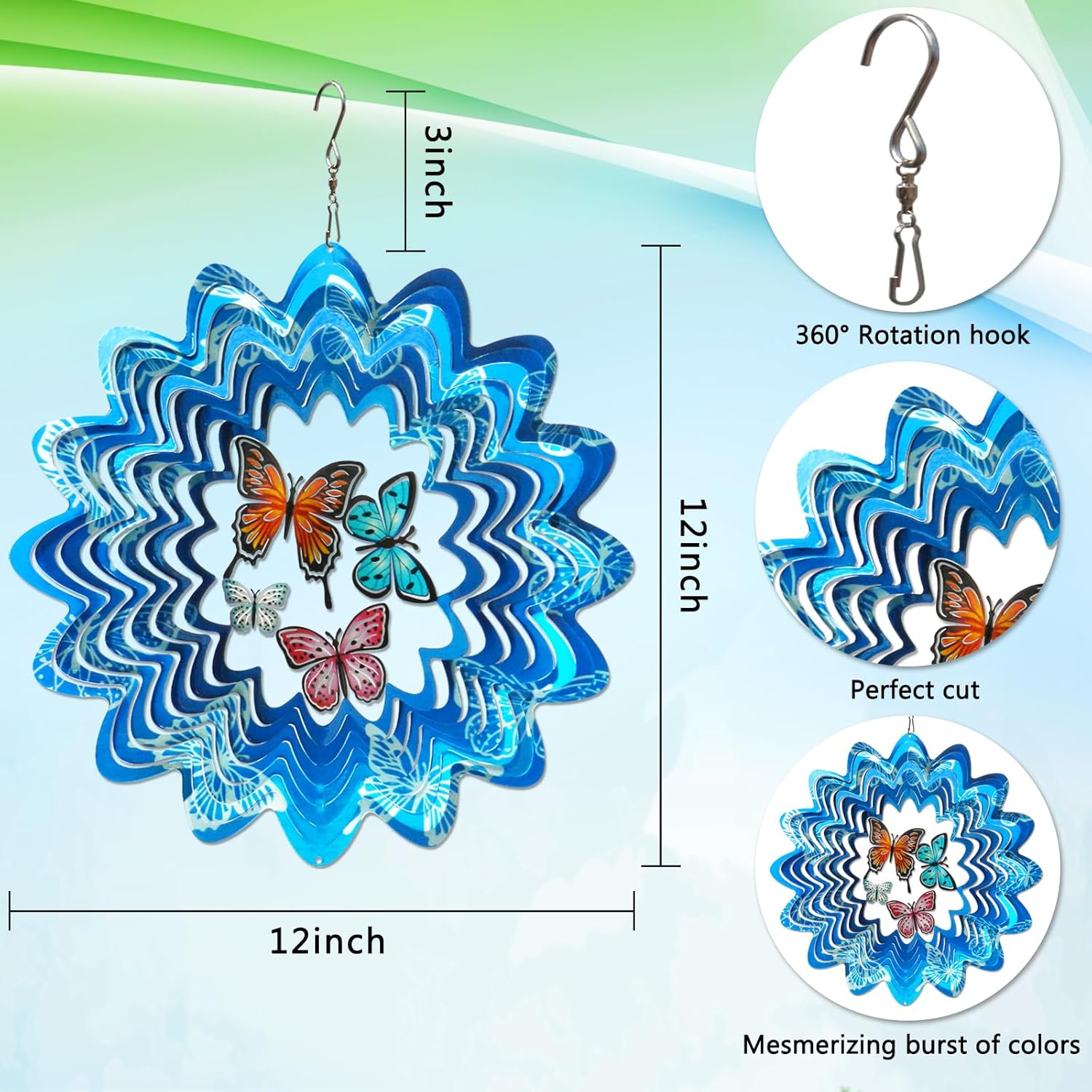 - ăTop-Tier Stainless Steel Wind SpinnerăThe 12inch laser cut metal wind spinner has magical layers and delicate details, made of high quality 304 stainless steel, UV coating that enhances the sparkle, shine, and color for lasting outdoor beauty.