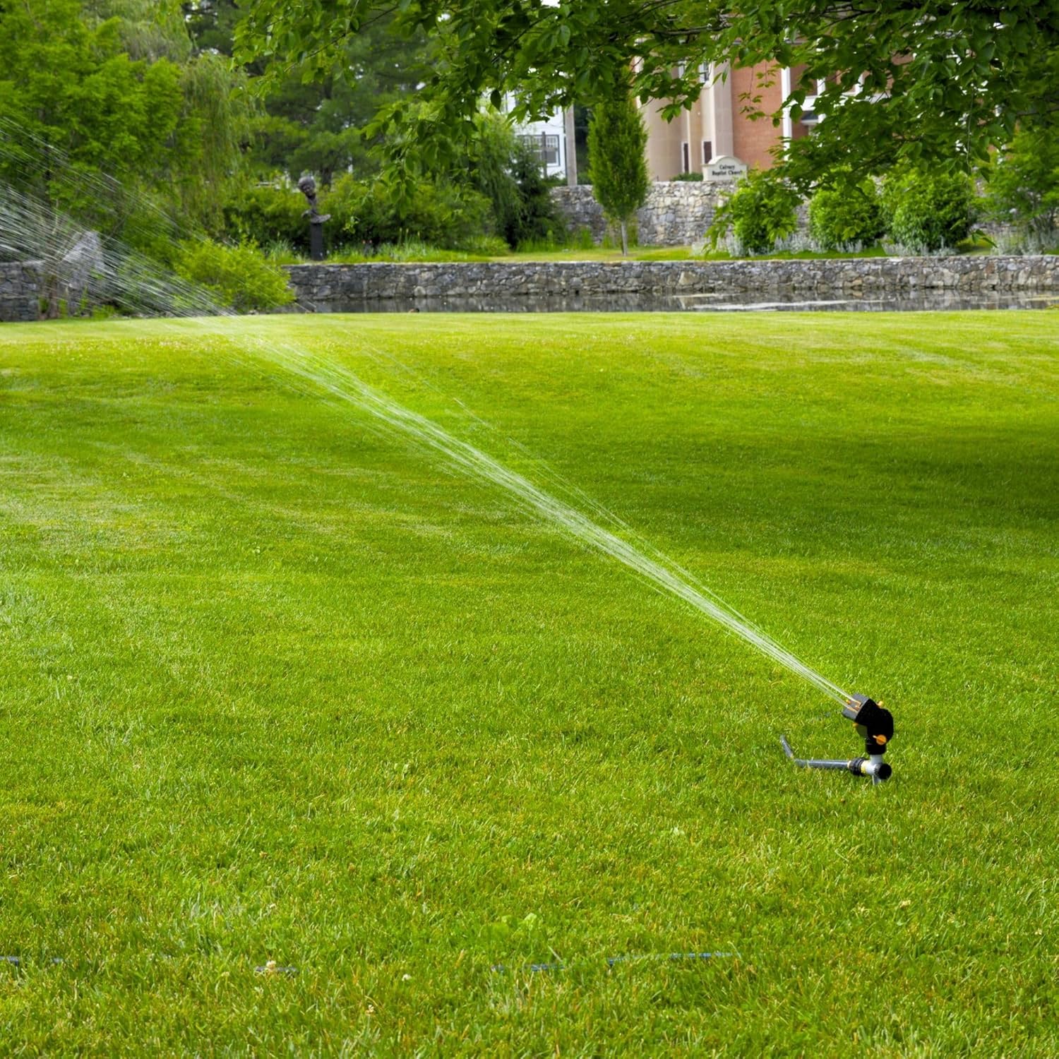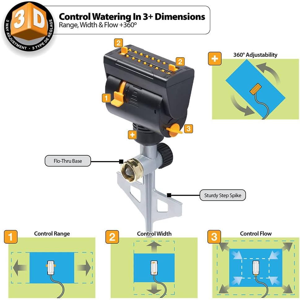 - Flo-thru base allows unit-to-unit connection so multiple sprinklers can be set up throughout the yard