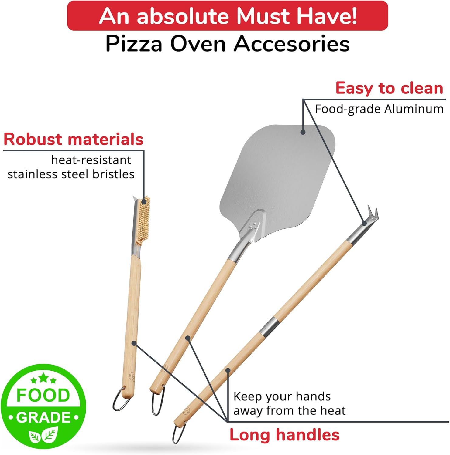 - Built for Safety and Convenience: Each tool features extended handles (32" turner, 26" brush, 32" total peel length) keeping hands safely away from heat while providing excellent control during cooking and cleaning.