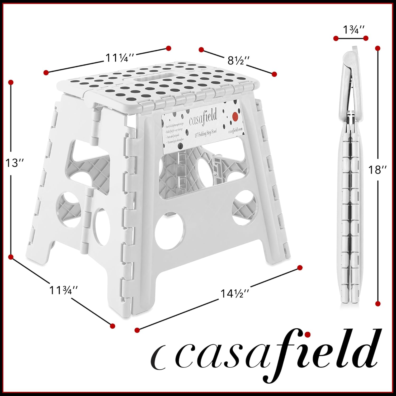 - Textured, grip-dot surface: The unique design of Casafield's folding step stool includes a stylish and textured, grip-dot, no-slip step surface, making this stool safe to use for adults. The step surface measures 11.25" W x 8.5" D, providing plenty of footing space.