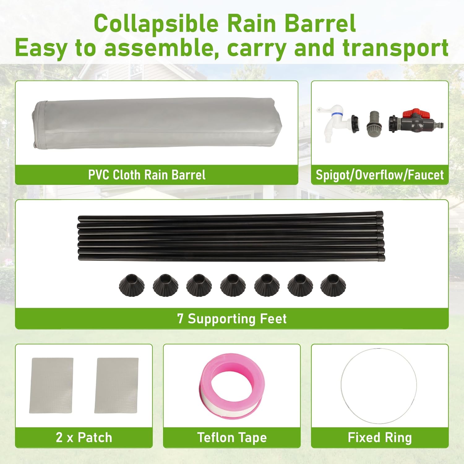 - Package Includes:1 x Collapsible Rain barrel, 7 x Supporting Legs, 1x Filter, 1x Spigot, 1x Overflow, 1x Teflon Tape, 1x Fixed Ring, 2x Patch