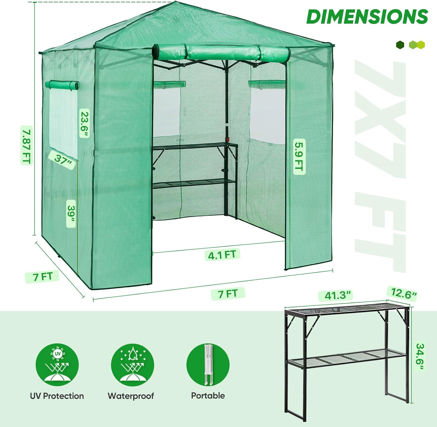 EAGLE PEAK 7x7 Pop up Greenhouse Portable Walk-in Outdoor Gardening Green House with 2 Foldable Shelves, Roll-up Zipper Entry Door and 3 Mesh Windows, PE Cover, Green/Clear