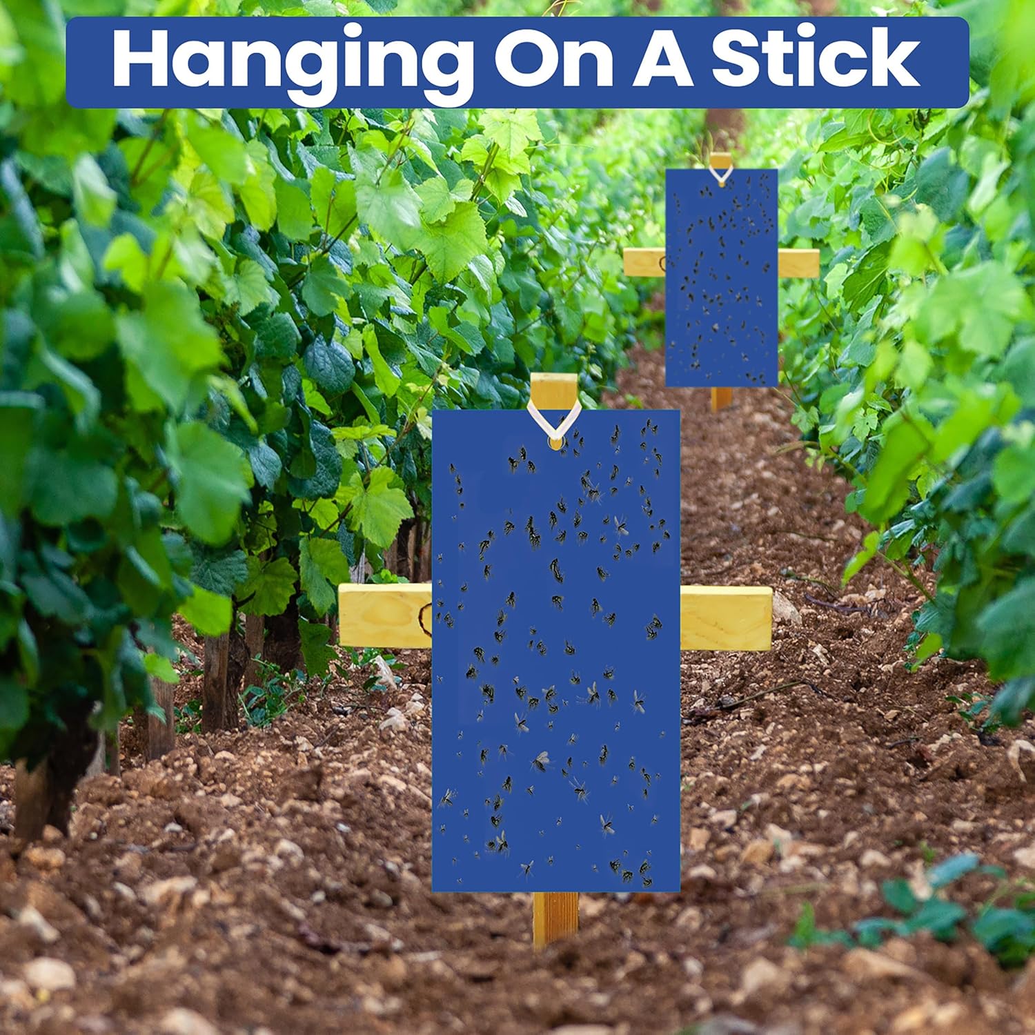 - Double Sided Stickiness: our blue sticky traps are designed to be double sided, widely capture the most pests, includes white flies, leaf miners, fungus gnats, shore flies, midges, mosquitoes, and other flying insects, you can place them in the garden, lawn, yard, next to the trash can and so on
