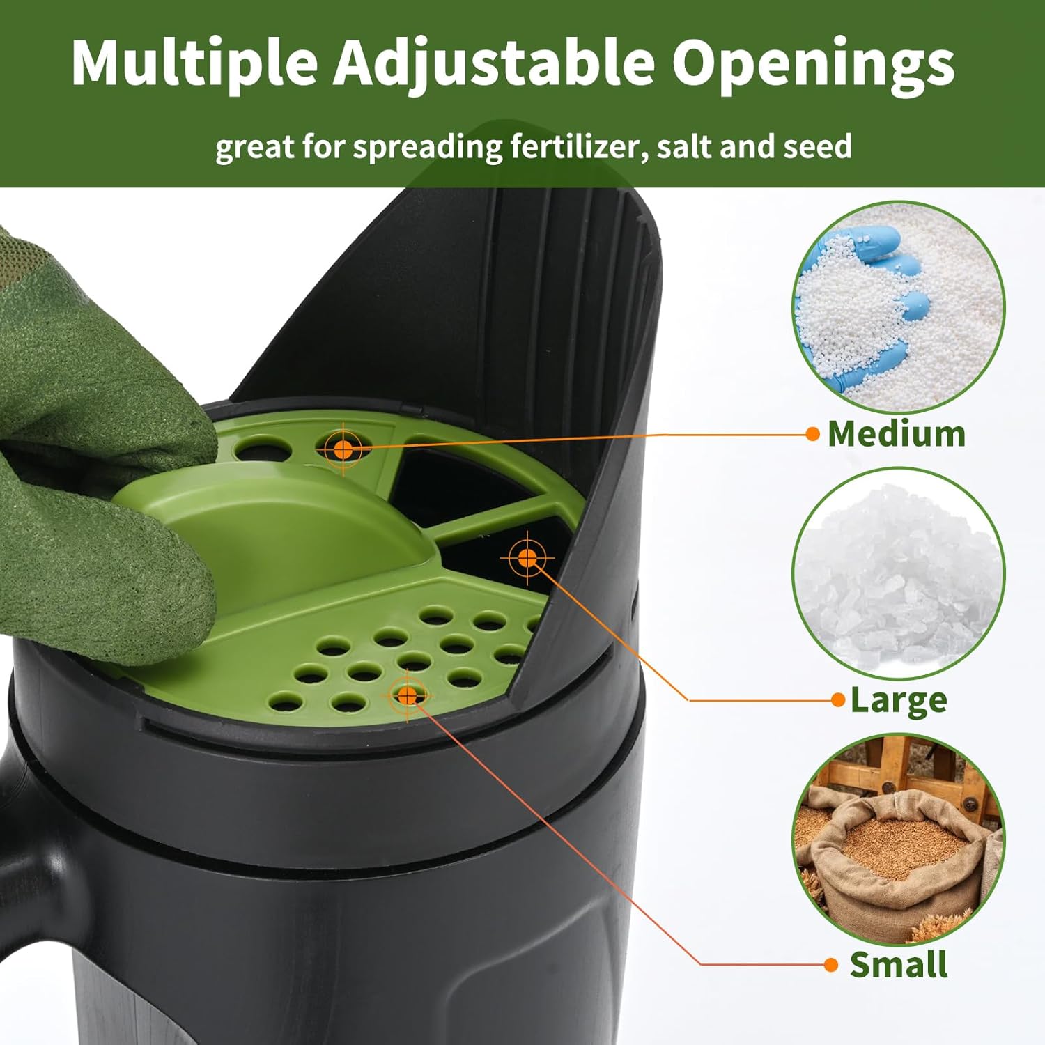 - Multipurpose : It's a multifunctional tool to use anytime and anywhere. Our handheld spreader helps spread salt to deice your sidewalk and driveway in winter, broadcast the grass seeds or distribute the fertilizer in your lawn or garden in spring or summer.