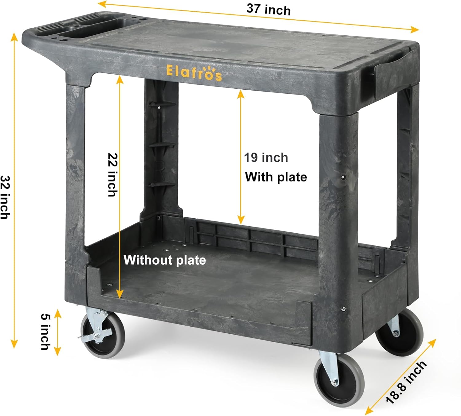 - 🔆 PERFECT SIZE AND STORAGE WEIGHT: This commercial-grade utility cart overall dimensions is 37Lx18.8Wx32H inches (93.5Lx47.7Wx81H cm). Shelf size is 30Lx18.8W inches (76L*47.7W cm). The flat top design makes this cart an ideal work table anywhere. Rounded corners protect walls and furniture from dings; Offering 550 pounds of storage weight capacity 275 pounds for each shelf, perfect for the heaviest loads.