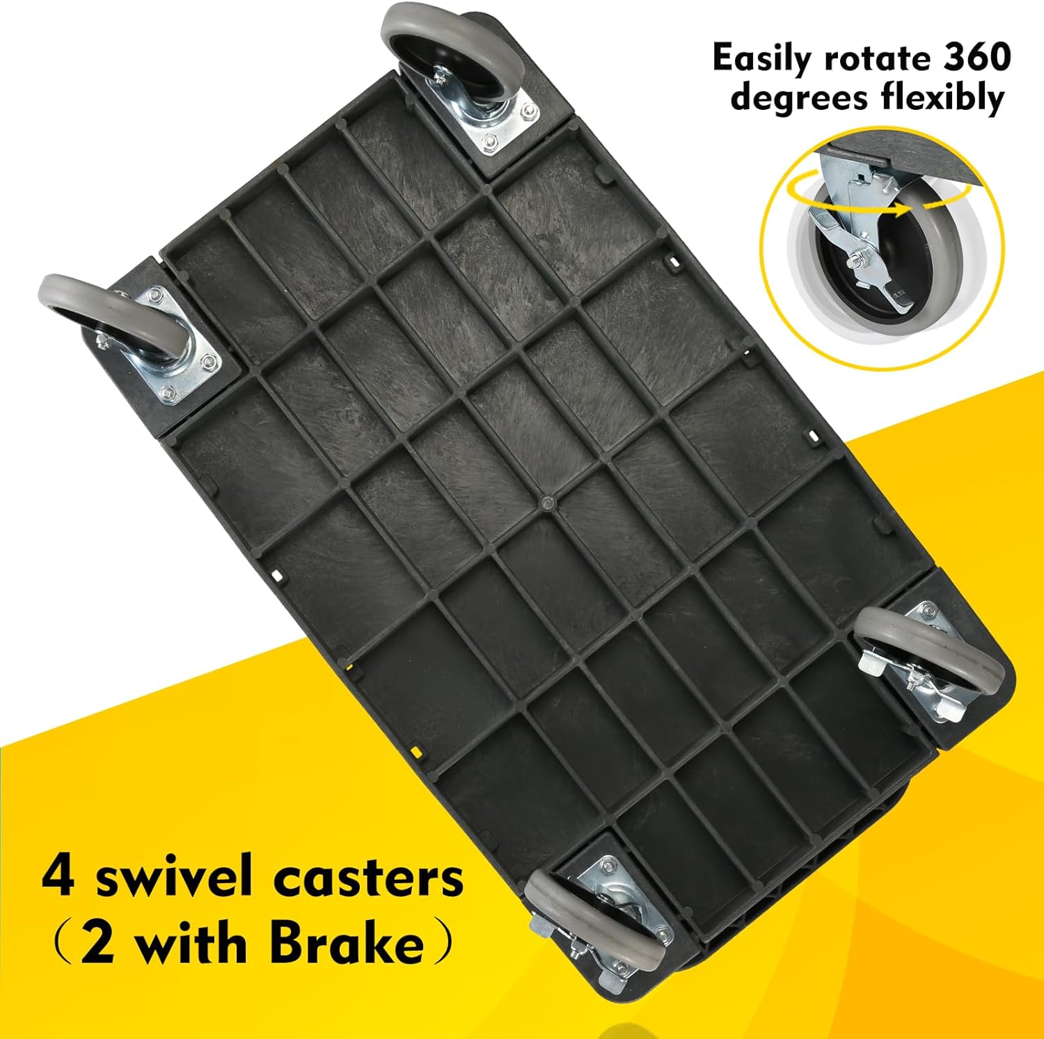 - 🔆EASY MANEUVER & LOCKING BRAKES: With the help from 4 swivel casters(2 with Brake)5-inch (12.7cm) diameter wheels, it can effortlessly control the direction of cart even in narrow spaces. Internal wheel is made of industrial-strength polypropylene injection molding, which provides strength and toughness for smooth operation. outside is wrapped by Thermo-Plastic-Rubber for releasing shock and vibration for silent operation without floor scratches or carpet snags. Full swivel wheels can easily rotate 360 degrees flexibly, making transport easy and labor saving.