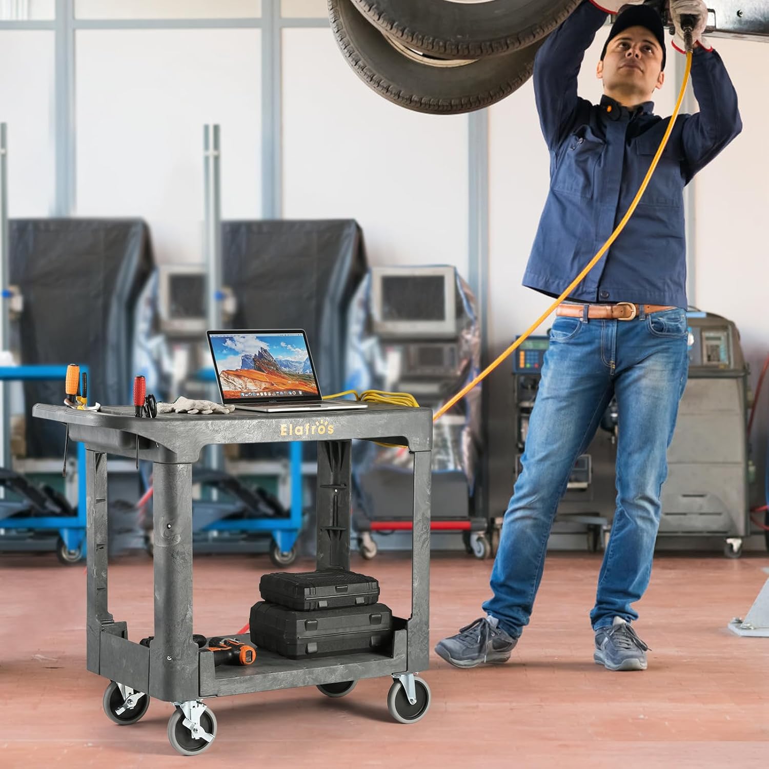 - 🔆 ERGONOMIC HANDLE AND CORD WRAP: Our service cart ergonomic push handle is molded into top shelf with a built-in storage compartment and 4 tool holders, which provides optimum hand placement and pushing height to improve control & worker safety. Molded In cord wrap allow you organize wire better.
