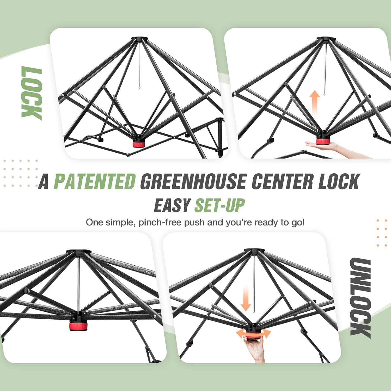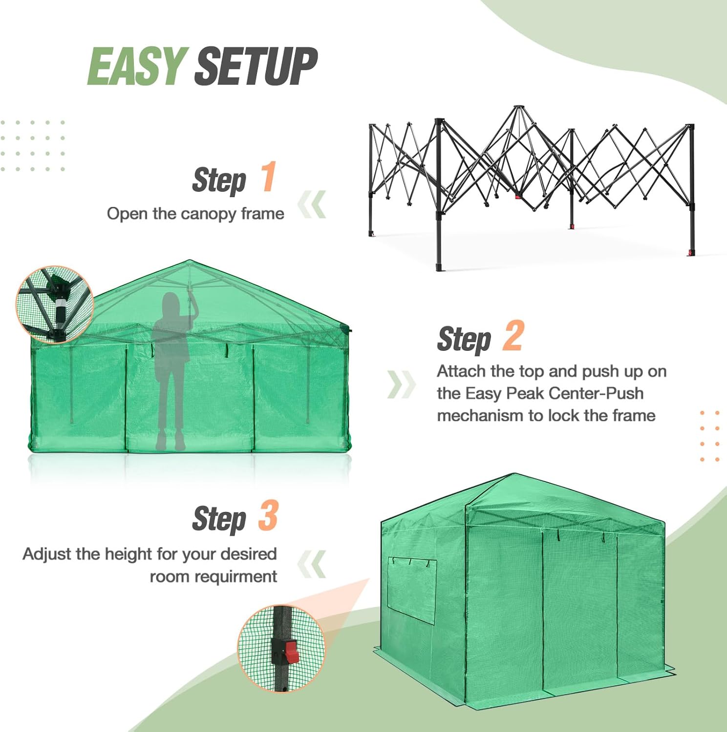 - EASY SETUP: This pop up greenhouse with patented center lock technology supports one person setup in seconds. The pre-assembled frame and innovative Peak Push locking system delivers a quick setup. No tools required. Whether you're a seasoned gardener or just starting out, the EAGLE PEAK pop-up greenhouse for outdoors saves you time and hassle