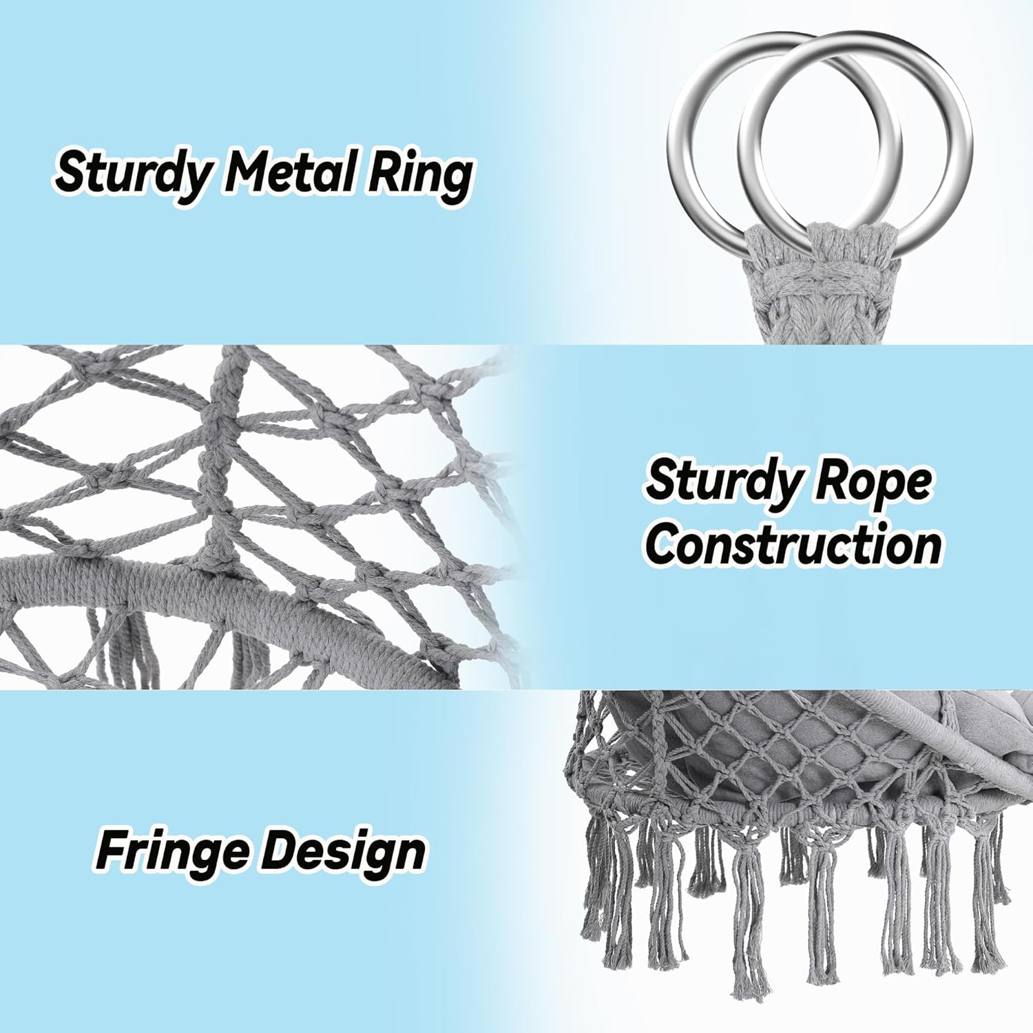 Macrame Hammock Hanging Swinging Chair with Oversized Cushion, Perfect for Bedroom, Porch, Kids, Adults, Balcony, Grey