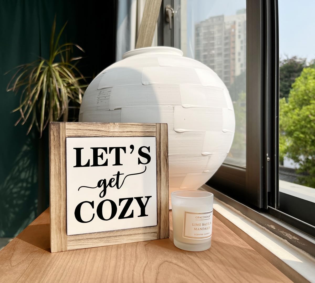 Inspirational Wood Signs, Box Wood Plaques Desk Décor, Farmhouse Home Decor Sign for Shelf, Family Table Decor for Kitchen Bedroom Dining Room, Living Room Decor, Housewarming Gift, Let's Get Cozy