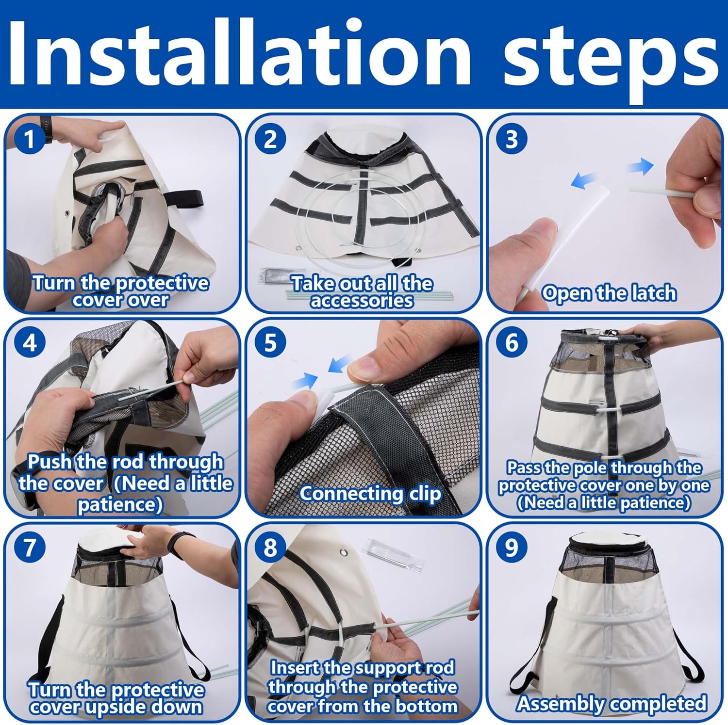 - Easy Setup: The upgraded support structure allows for simple assembly. It includes 3 circular ring supports and side supports, ensuring stability for years of reuse. You can refer to the picture for detailed installation steps