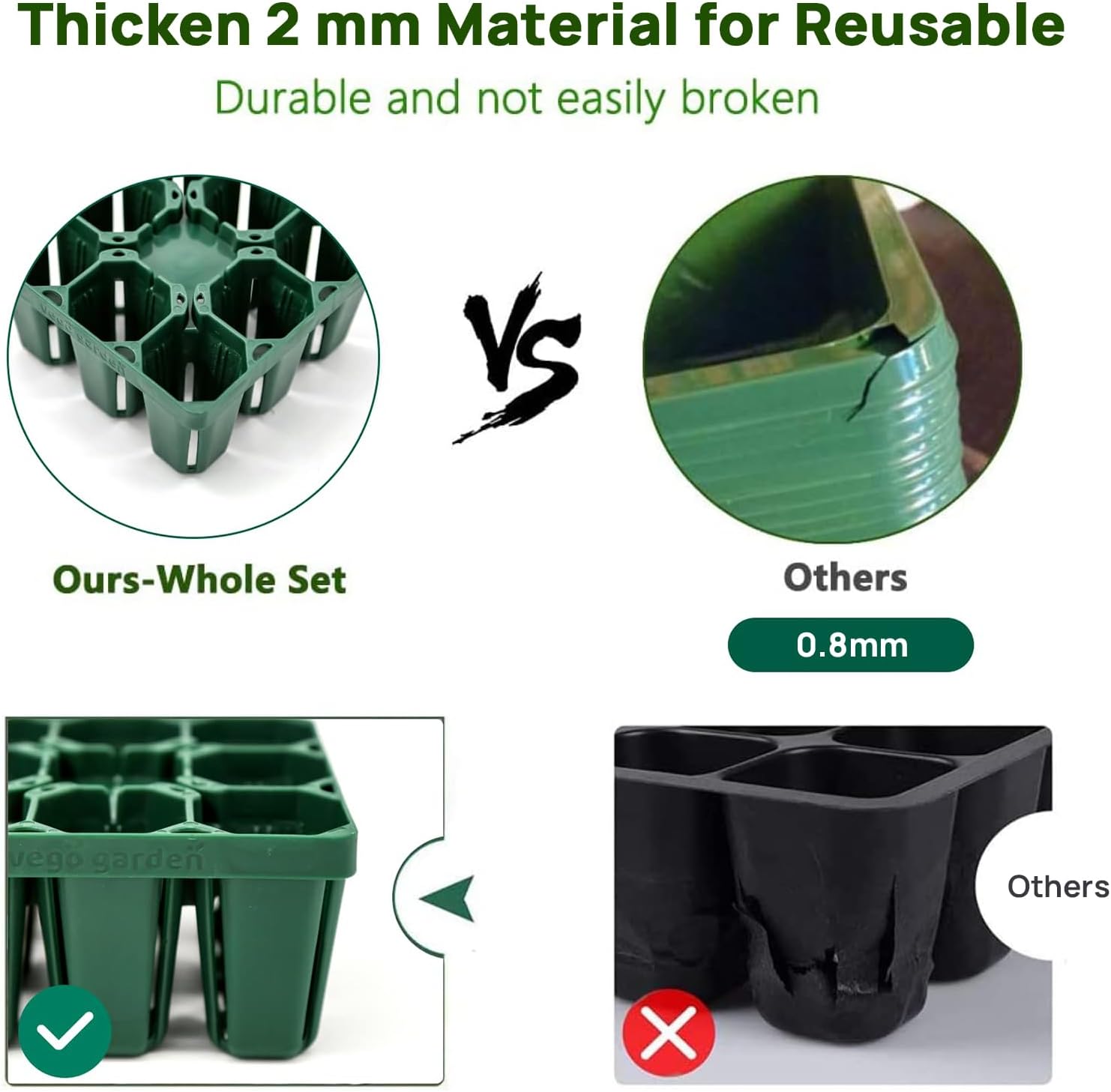- 【Made of High-quality Thicken 2 mm Material】Vego Garden seed trays use 2mm PVC material, stronger and not easy to deform, can be reused many times. The thickened bottom edge material that can withstand the pressure, it would not lose soil or soak up too much water, and effectively cultivate seeds