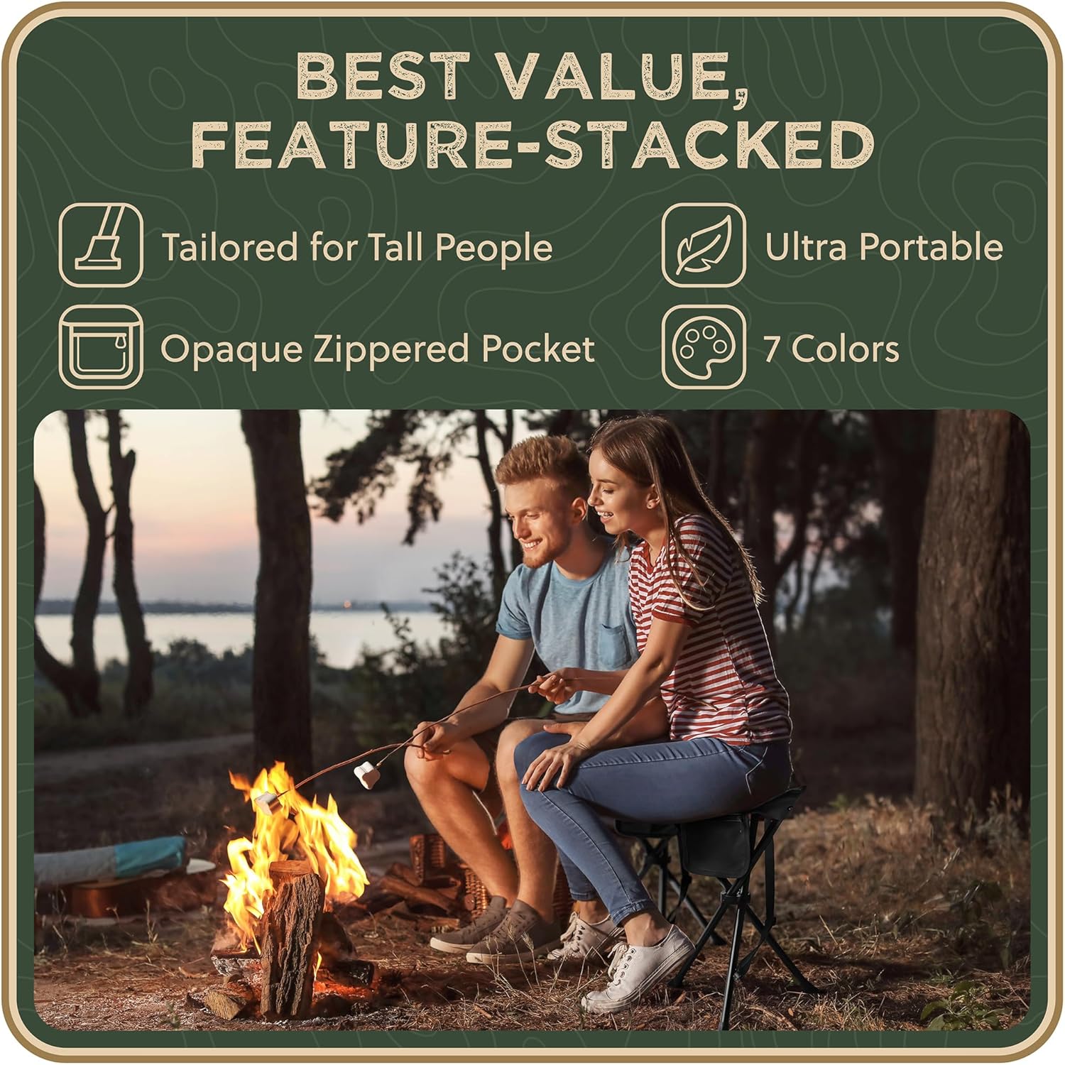 - SIT HIGH WITH COMFORT! The camp stool is 20 inches when unfolded: anyone can use it comfortably, even tall people, who often struggle with a portable chair that’s too low. This travel chair is for the optimal posture that’s good for the knees, too: no need to squat!