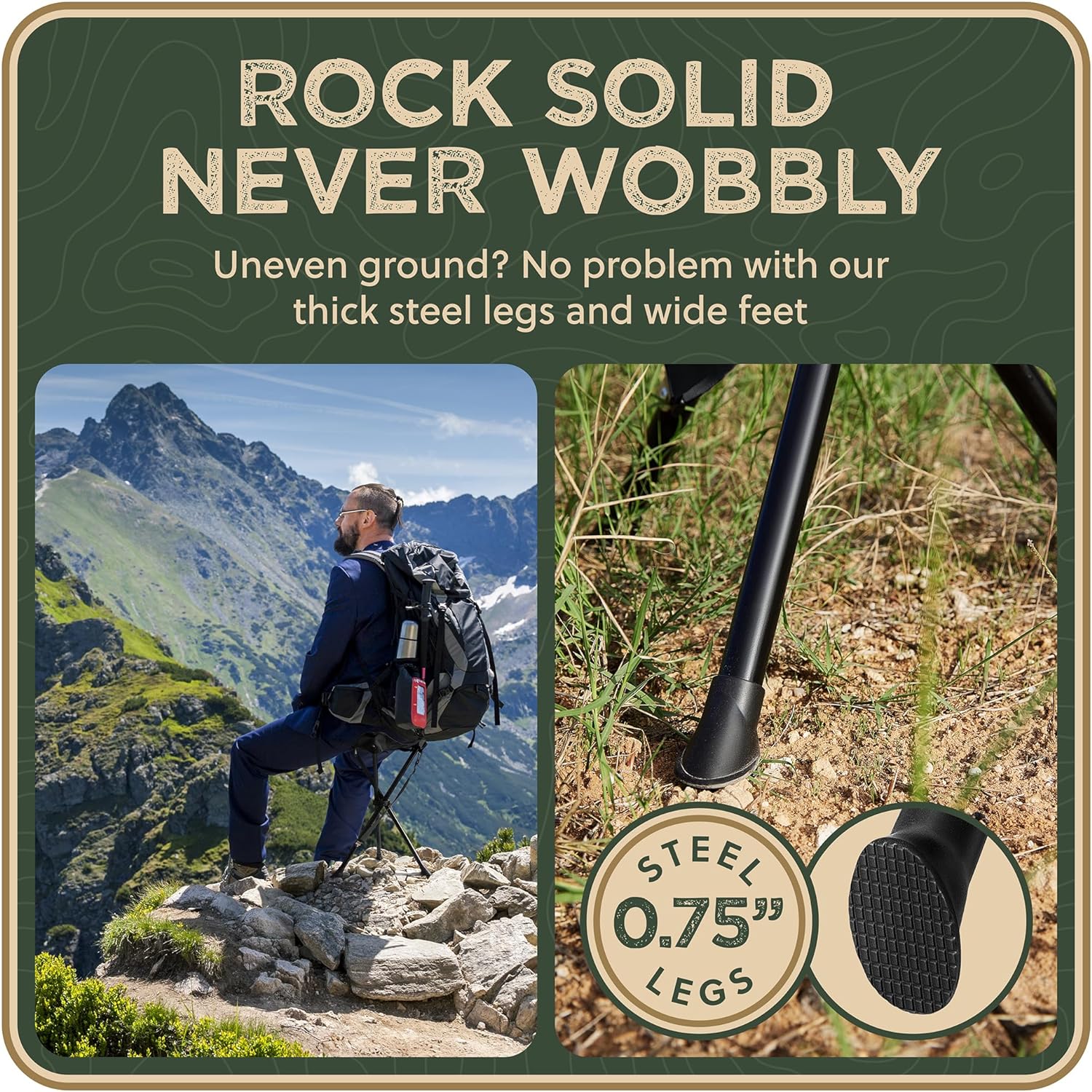 - STEADY FOR OUTDOORS. Even on rough ground, the travel stool doesn’t waver as it has thickened steel legs (0.75” pipes) and enlarged non-skid anti-slip feet. Among outdoor chairs portable tripod stools are scientifically more stable than 4-legged ones