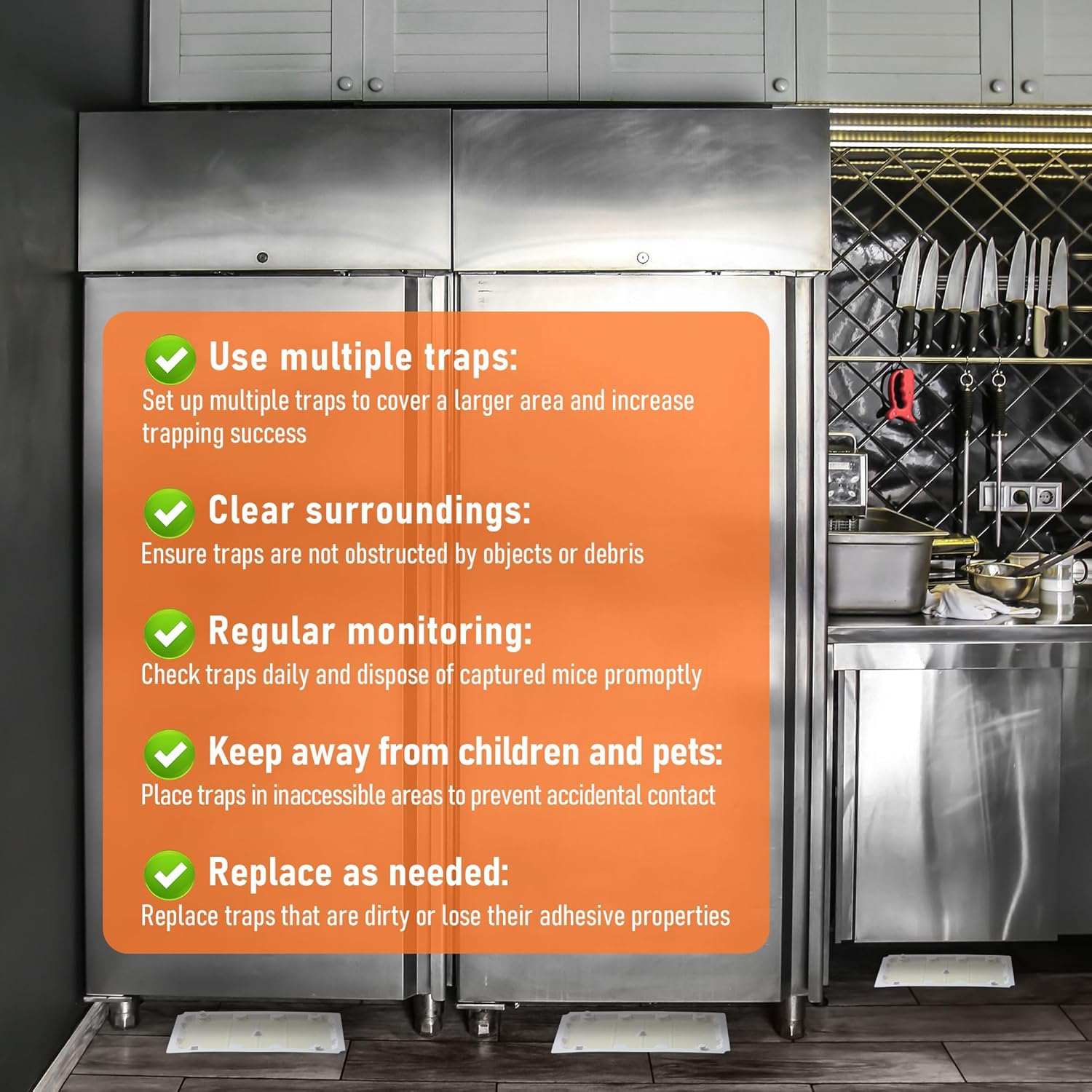 - Pest and Mouse Sticky Traps: sticky traps for mice can catch not only mice but also other common pests in your home, and we suggest you position sticky traps along active rodent runways, such as along walls, under large kitchen appliances, in cupboards, and other areas where rodents travel, be sure to fit the glue trap flush against a wall where rodents will run over and stick to it; And cold weather Qualirey glue traps for mice and rats can withstand 0° Fahrenheit weather