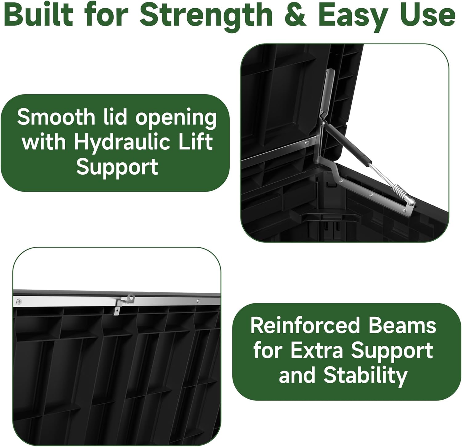 - STURDY AND RELIABLE BUILD:Designed with internal reinforcement, this deck box offers superior strength and stability compared to similar products. The robust panel construction and precise assembly help maintain its shape over time.
