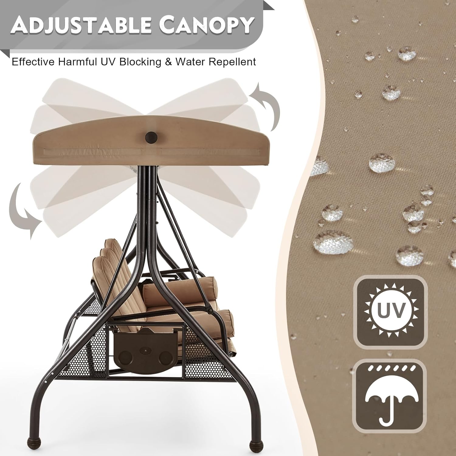 HOMREST 3 Seat Outdoor Porch Swing with Adjustable Canopy, Convertible Patio Swing Bed with Stand, Patio Glider Swing with Upgraded Cup Holder, Thicken Cushions & Pillow for Backyard (Brown)