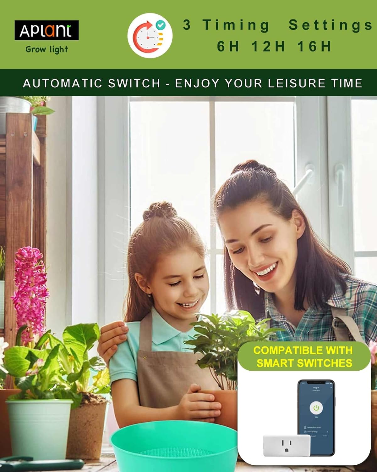 - 6/12/16H Timer: APLANT grow light for indoor plants full spectrum features auto circular memory timing function with 6, 12, and 16-hour cycles. The indoor grow lights can automatically turn on/off daily without manual intervention when you're away