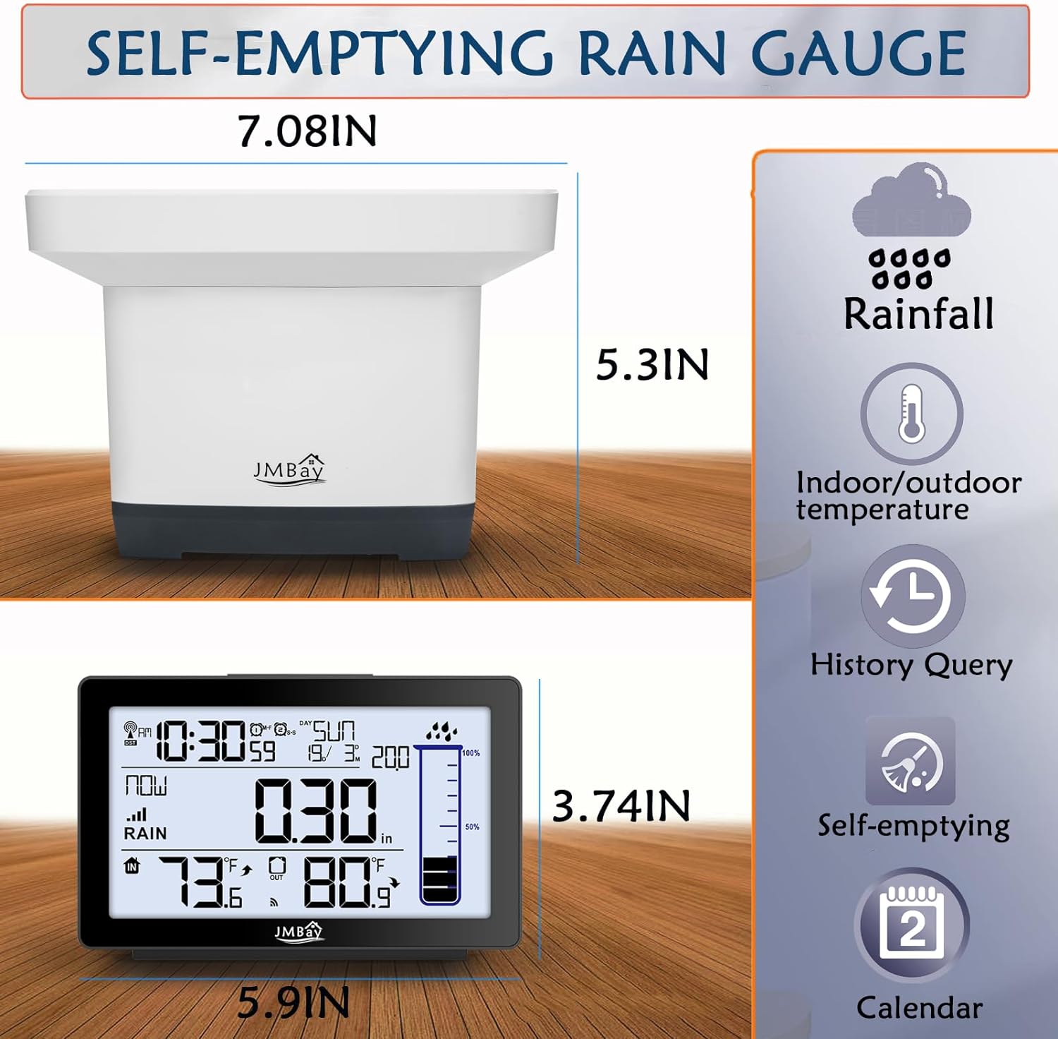 - Multi Function Rain Gauge weather station---In addition to rainfall monitoring, this digital rain gauge can also provide real-time indoor and outdoor temperatures, WWVB Radio control time function. What’s more, dual alarm clock with snooze function and calendar is practical in your usual life. Functional and stylish, JMBay rain gauge weather station is the perfect decoration for your living room, bedroom, office, greenhouse, tent, and more.