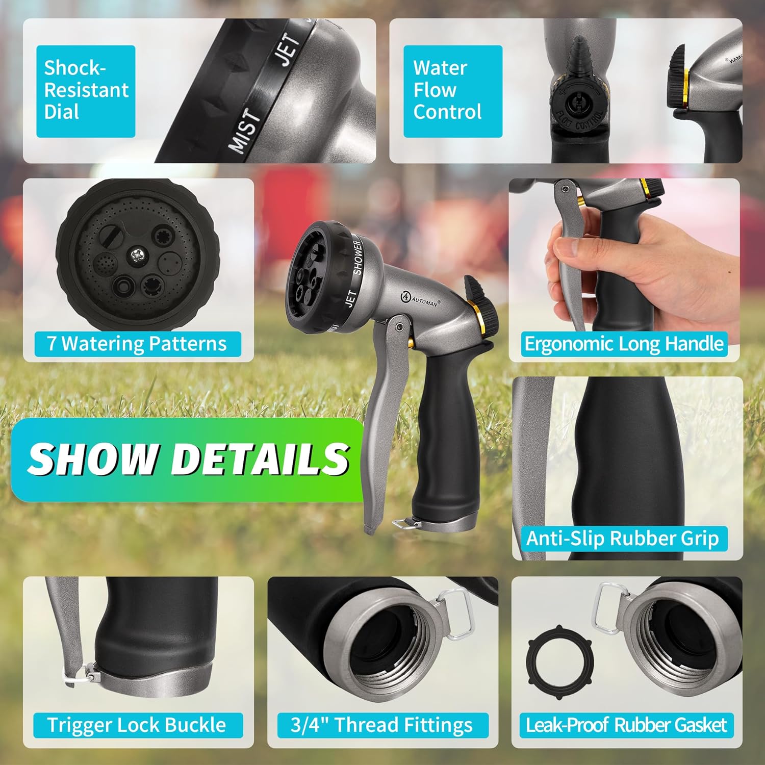 AUTOMAN Garden Hose Nozzle - 7 Patterns Sprayer, 100% Metal High Pressure Spray Nozzle, Labor-Saving Design, Heavy Duty Water Hose Nozzle for Garden Watering, Car Washing, Window Cleaning,Pets Bathing