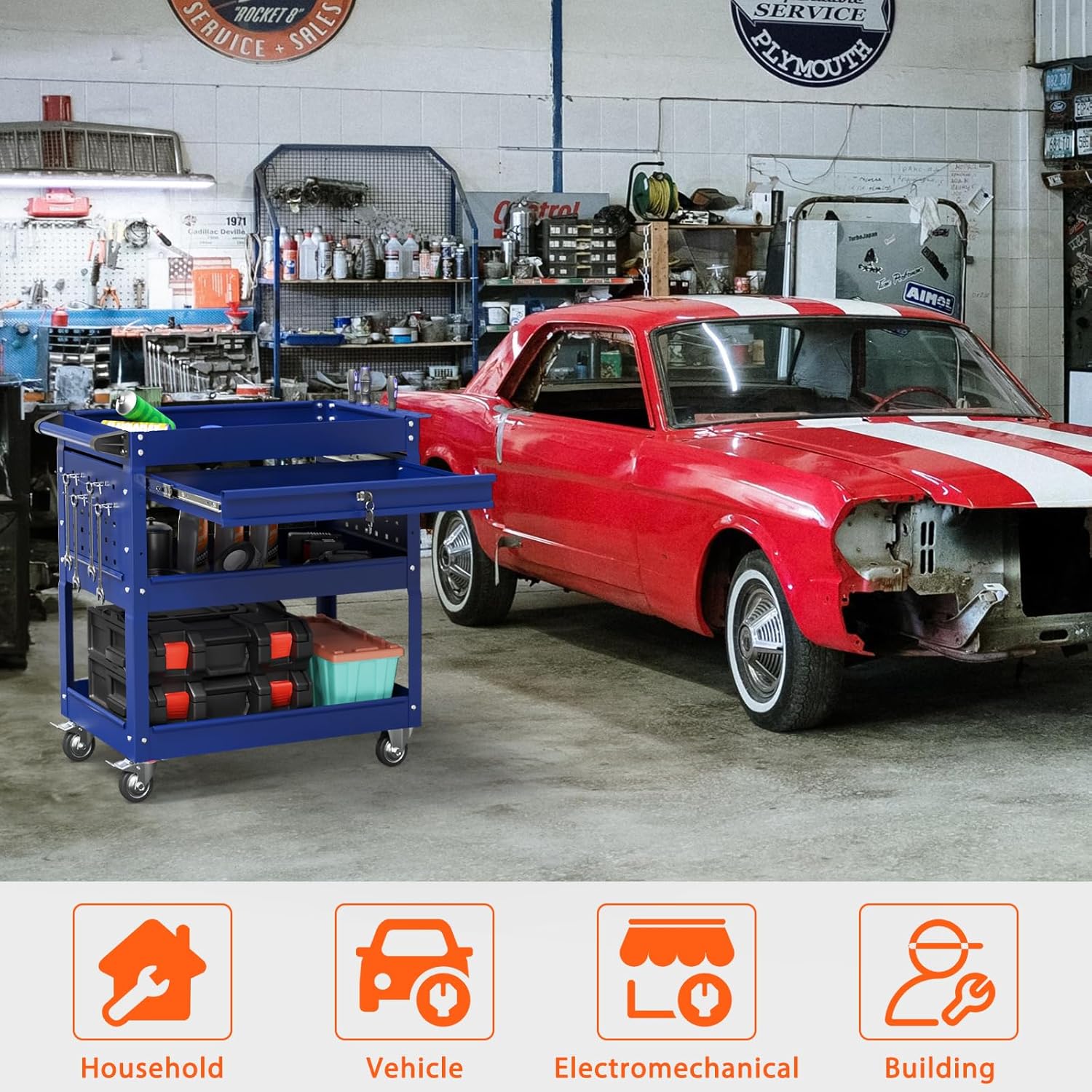 3-Tier Heavy Duty Utility Cart on Wheels, Rolling Tool Cart on Wheels with a Drawer, 350 Lbs Load Capacity Rolling Tool Storage Organizer for Garage, Warehouse and Repair Shop(Dark Blue)