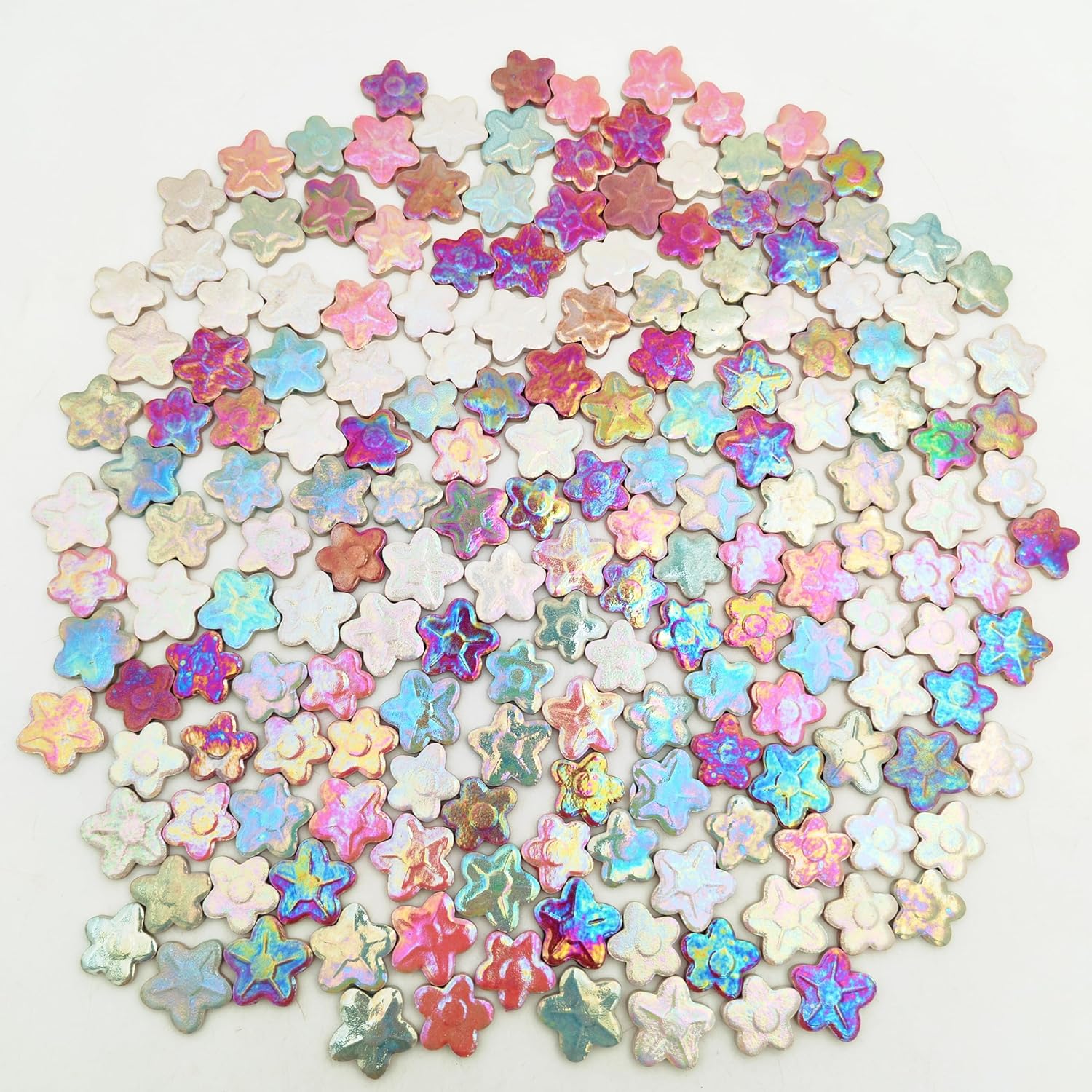 - The Small Flower Mosaic Tiles 2 Size: Medium Diameter: 2.45cm/0.96"; Small Diameter: 2.15cm/0.85" ; Thickness: 0.4cm/0.15 Inch;About 180 PCS Flower Mosaic Tiles Random Color & Size in a OPP Package